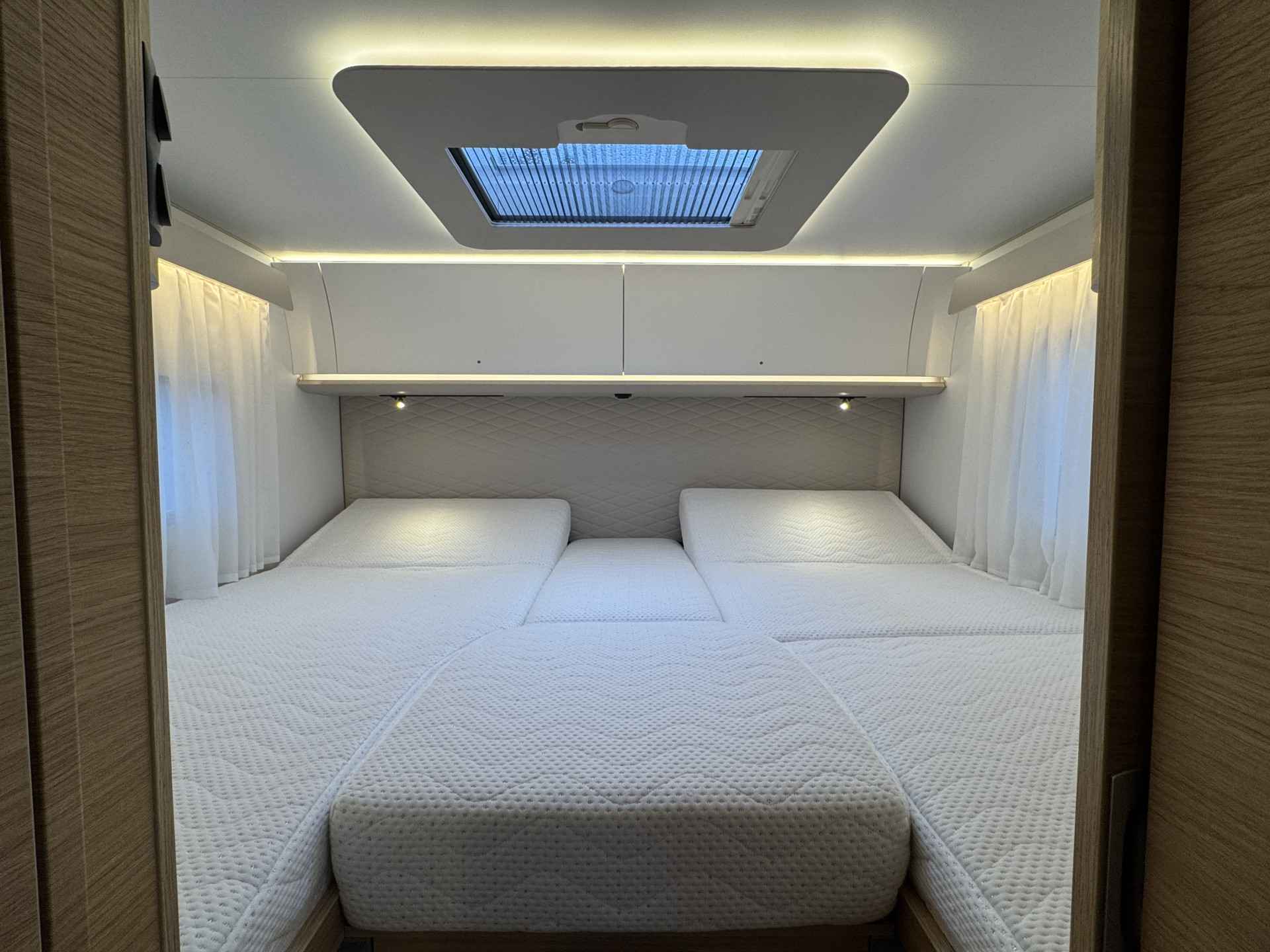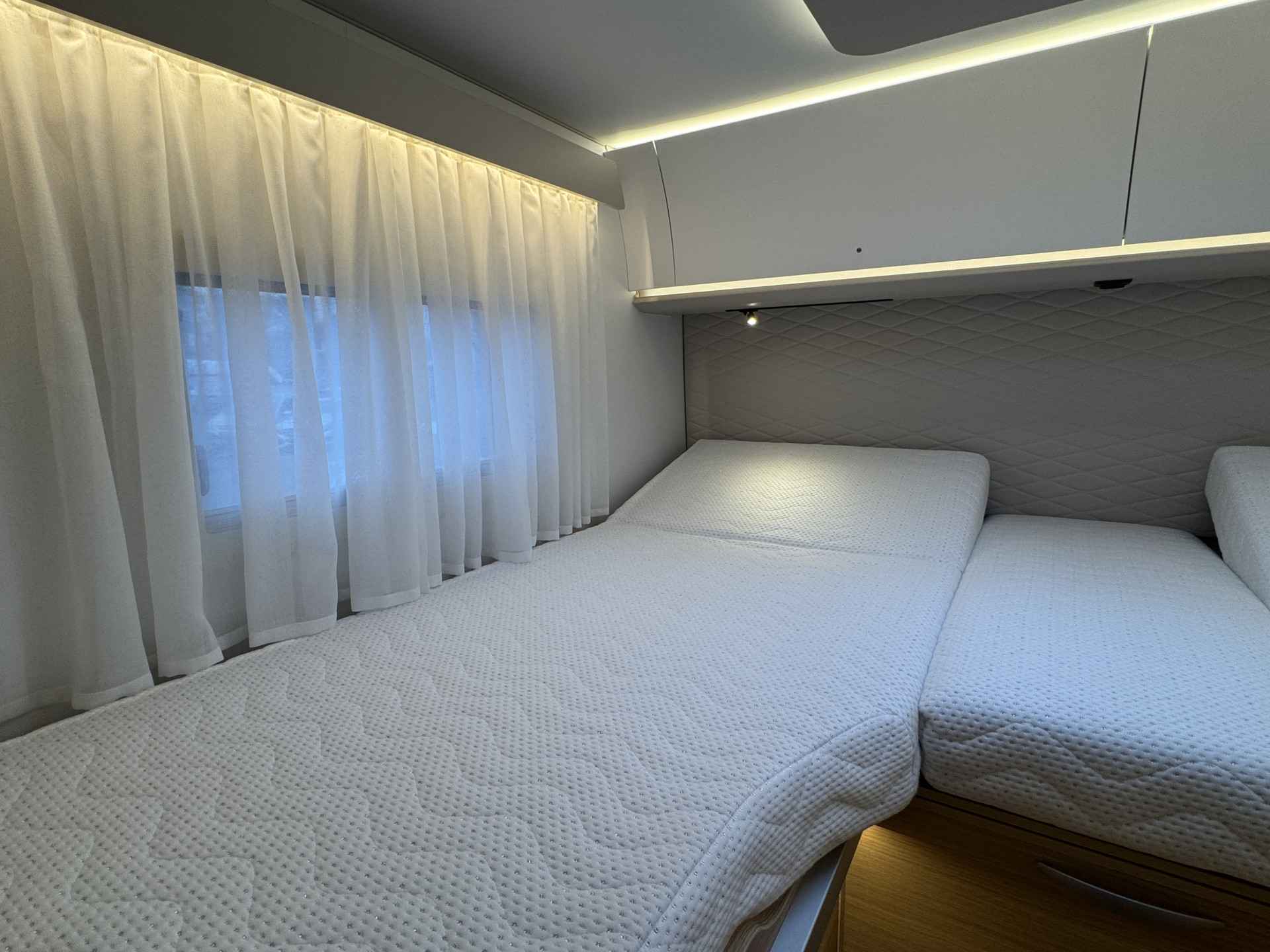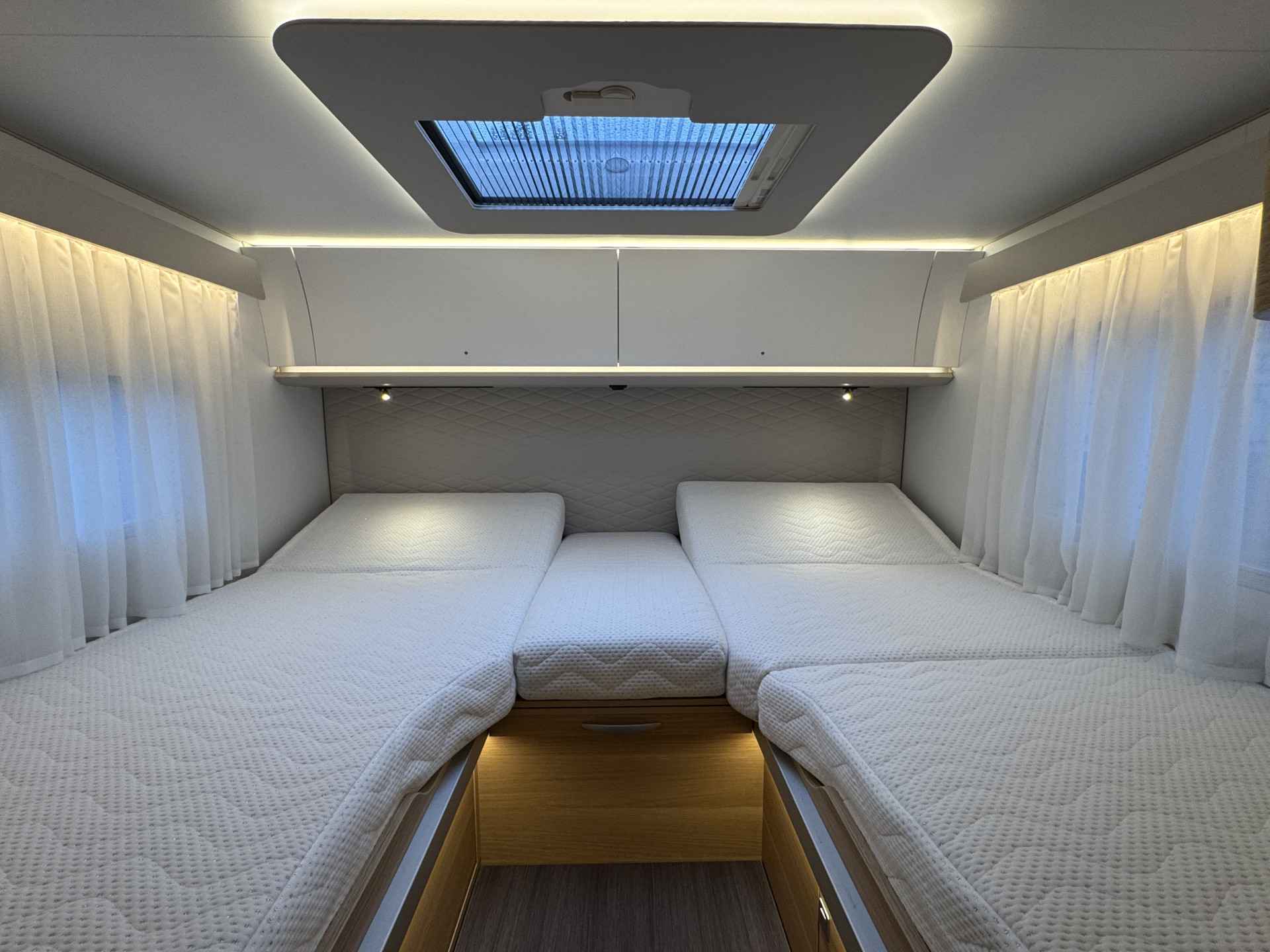 - Ruime enkele lengtebedden met daaronder een XXL garage (maatvoering bedden 205 cm x 80 en 203 cm x 80 cm Lengte x breedte)