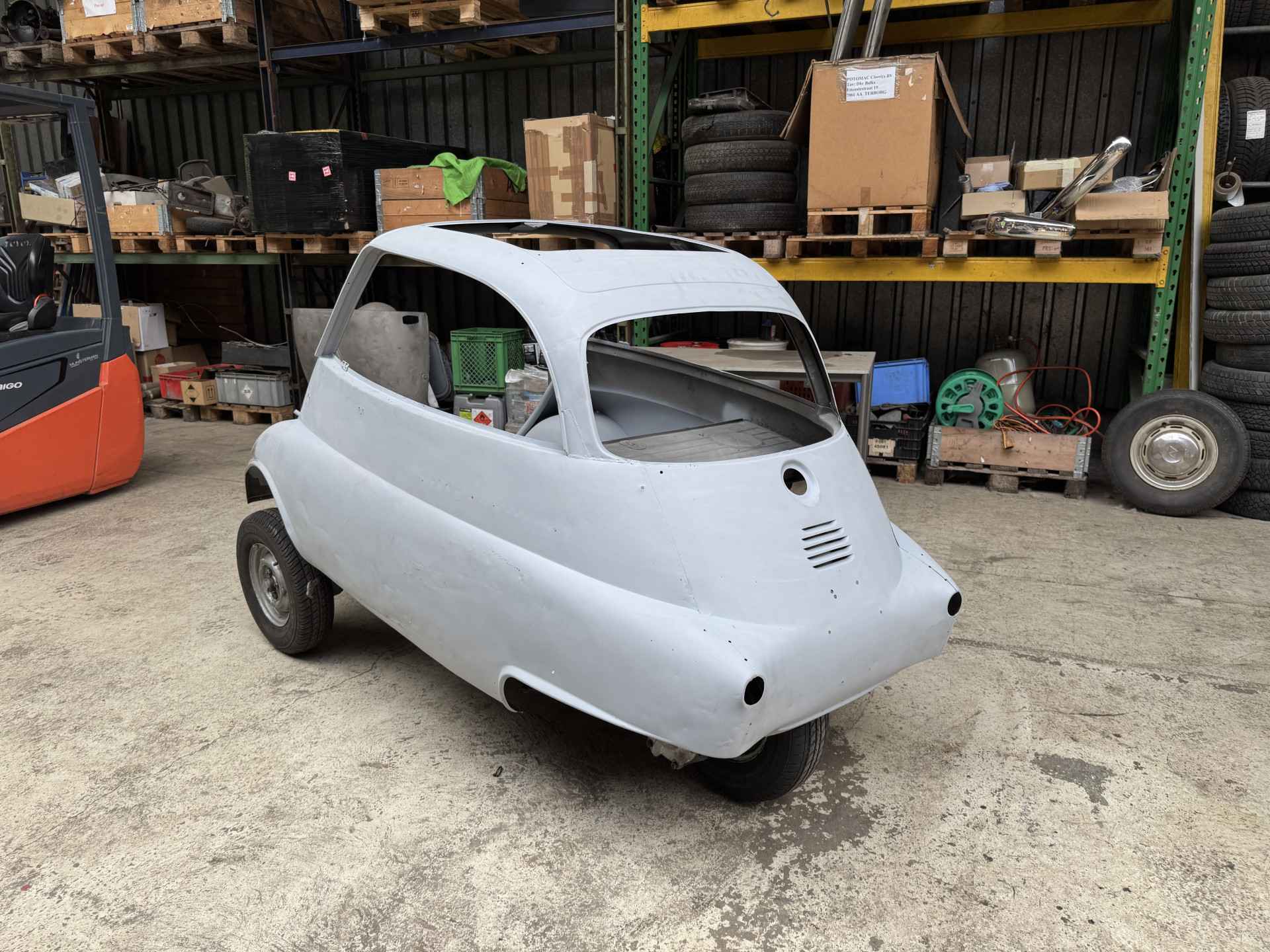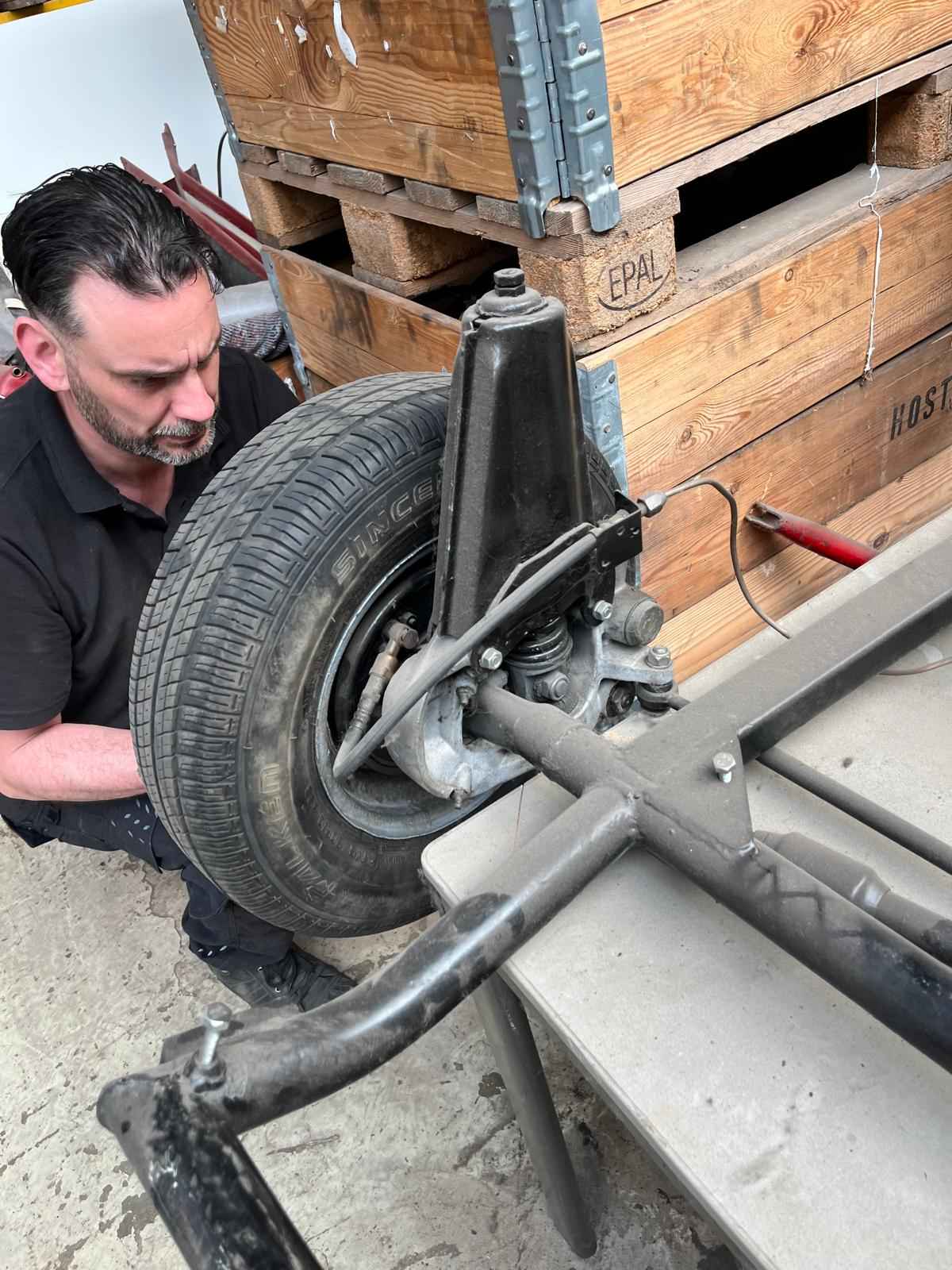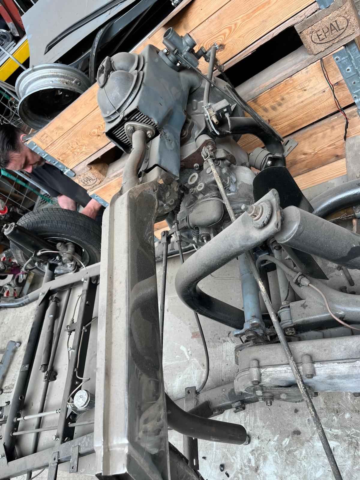 De cabine is gestraald en staat in de grondverf. Het chassis is al gedaan en de auto is verder compleet.