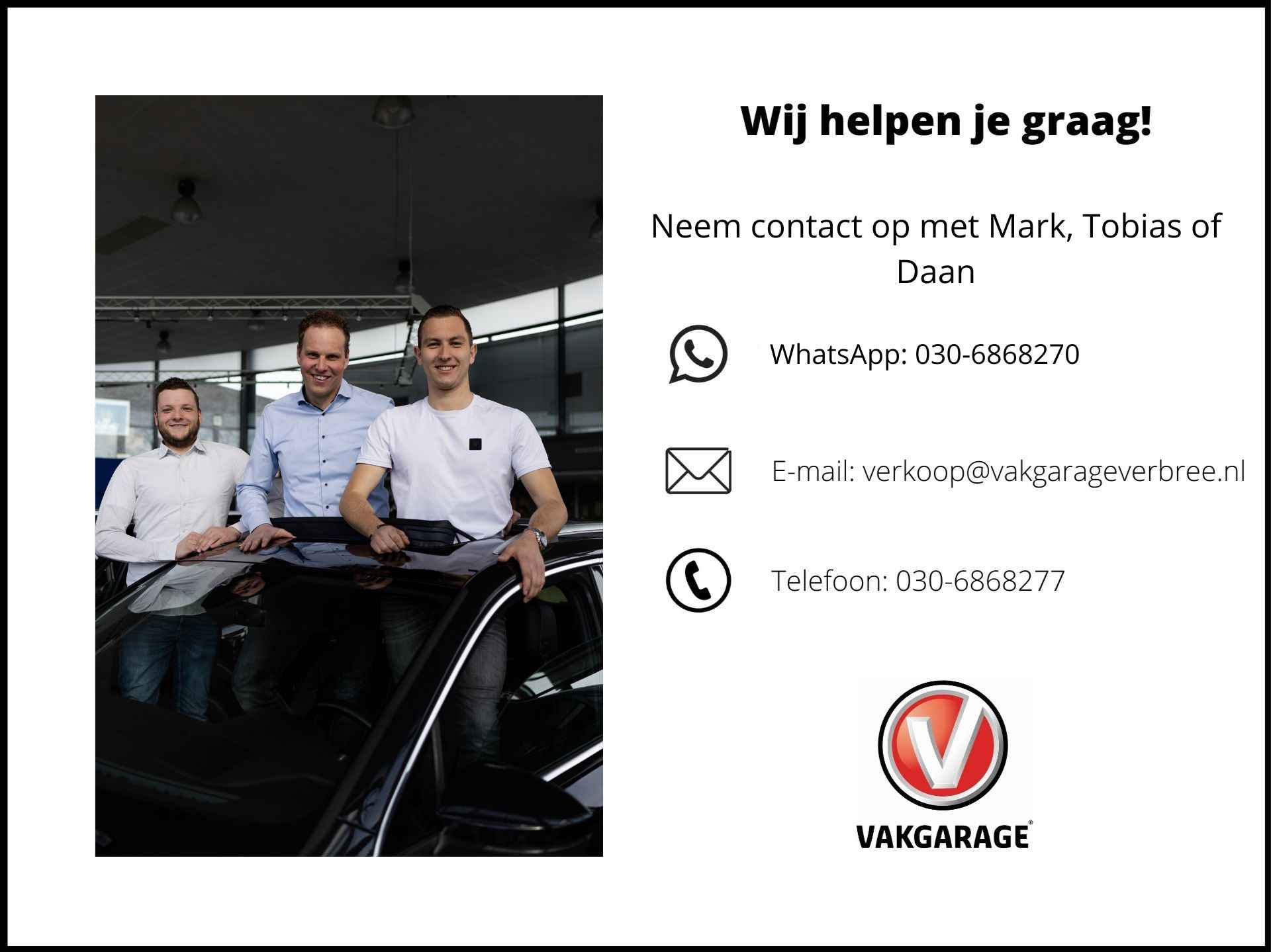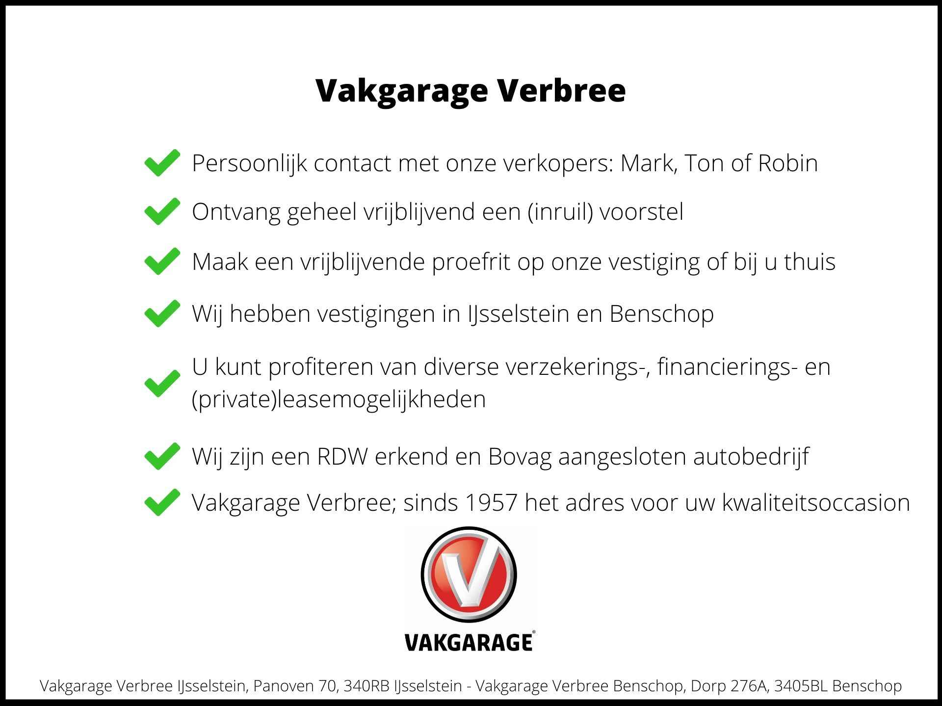 Wat leuk dat u deze auto heeft gevonden! Wij zijn Vakgarage Verbree; als familiebedrijf combineren wij de voordelen van een moderne autodealer met de persoonlijke benadering van een dorpsgarage. Uw adviseurs Tobias, Mark, Swen en Daan vertellen u graag meer. Bereikbaar via telefoon: 030-6868277 of WhatsApp: 030-6868270.