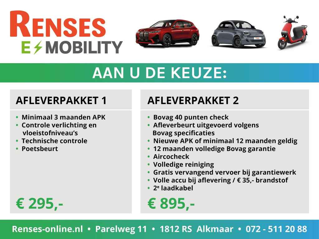 Bel voor een afspraak of proefrit met 072-5112088. Voor fiscaal advies over uw nieuwe auto kijk op renses-online.nl en maak een afspraak met één van onze specialisten. Uw huis of uw bedrijf verduurzamen? Maak dan kennis met ons nieuwe zusje Cirqulus.nl. Aan de getoonde afbeeldingen en specificaties kunnen geen rechten worden ontleend.