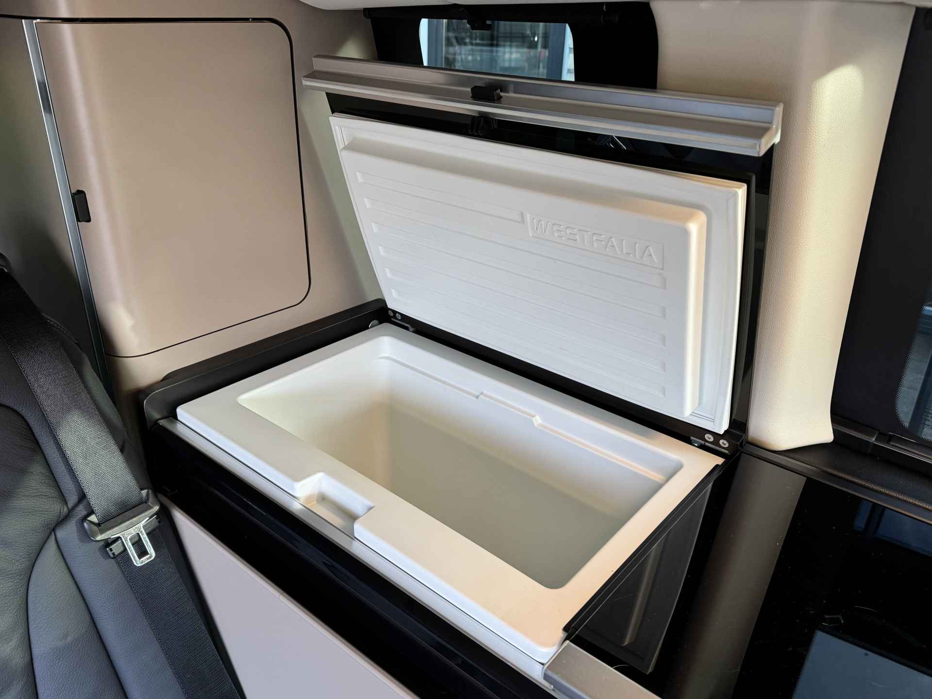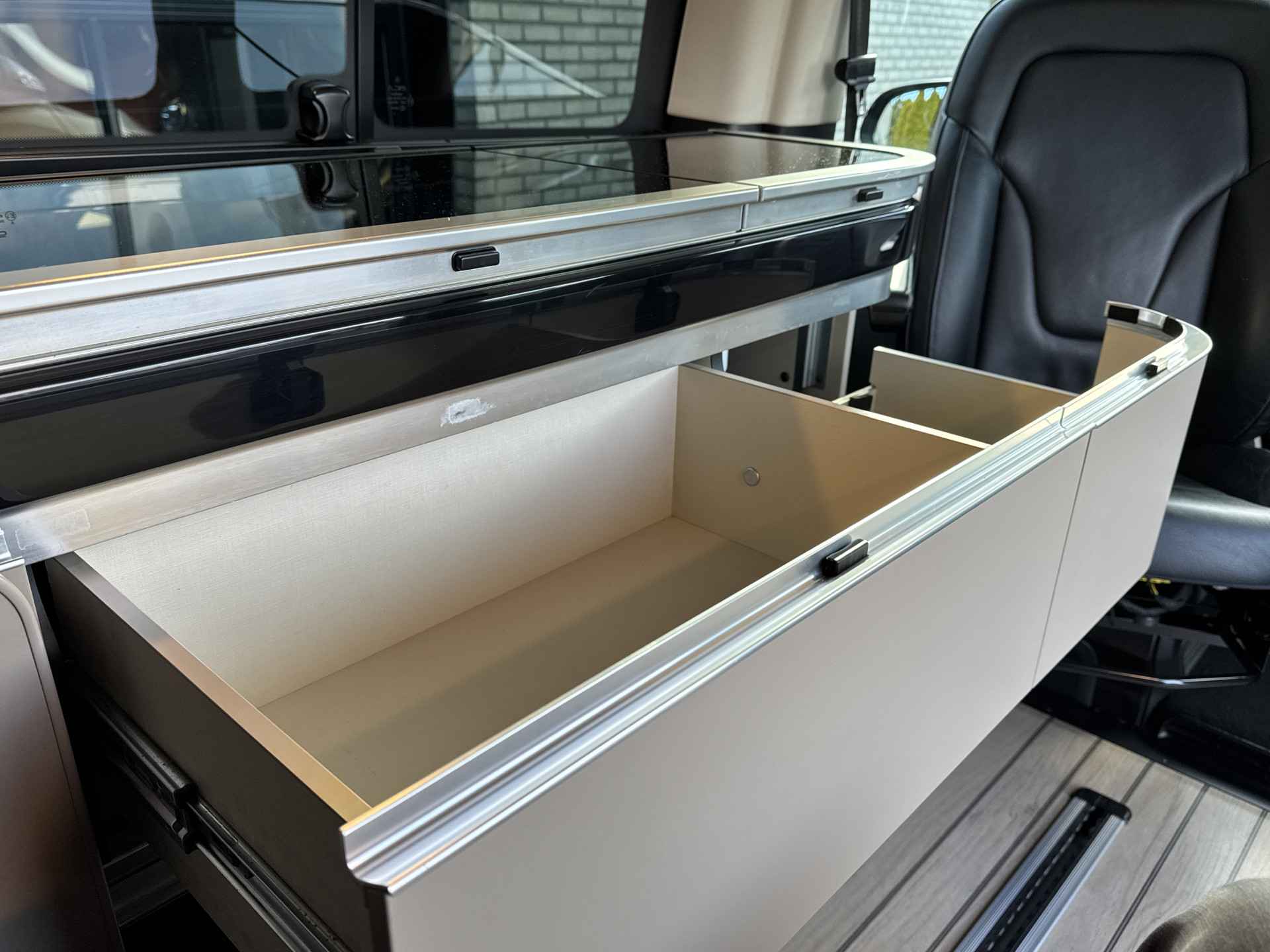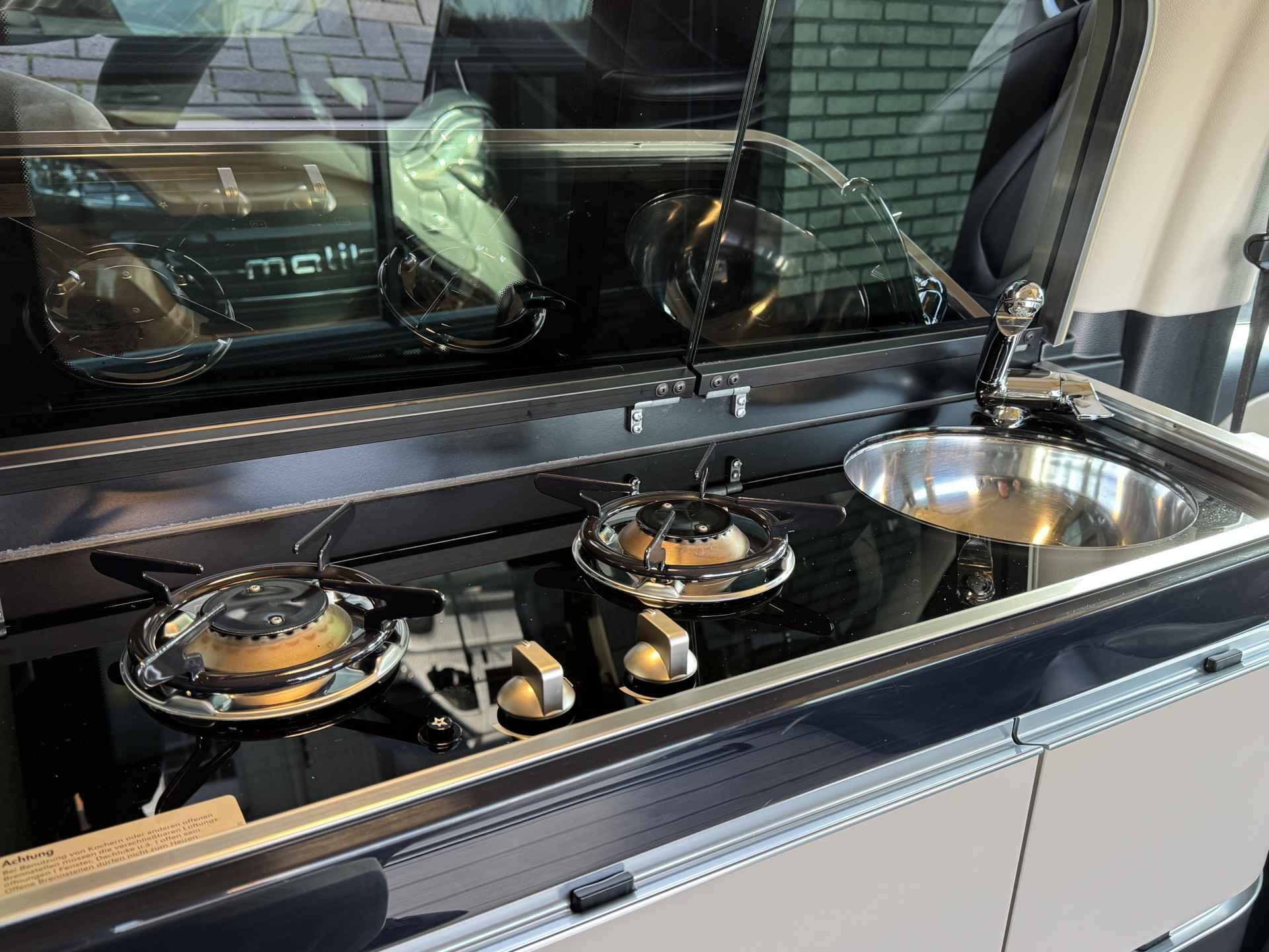 Het woon/leef gedeelte is ruim opgezet en voorzien van een compacte keuken voorzien van een 2 pits gasstel, voldoende opbergruimte, wasbak, en een compressor koelkast.