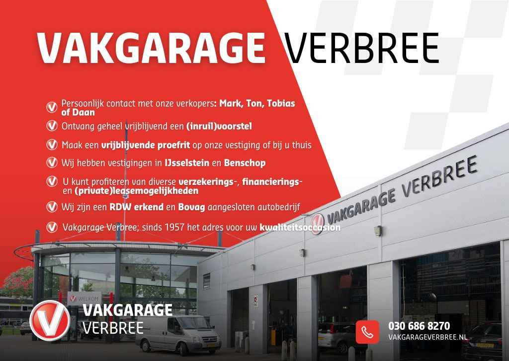 Wat leuk dat u deze auto heeft gevonden! Wij zijn Vakgarage Verbree; als familiebedrijf combineren wij de voordelen van een moderne autodealer met de persoonlijke benadering van een dorpsgarage. Uw adviseurs Tobias, Mark, Swen en Daan vertellen u graag meer. Bereikbaar via telefoon: 030-6868277 of WhatsApp: 030-6868270.