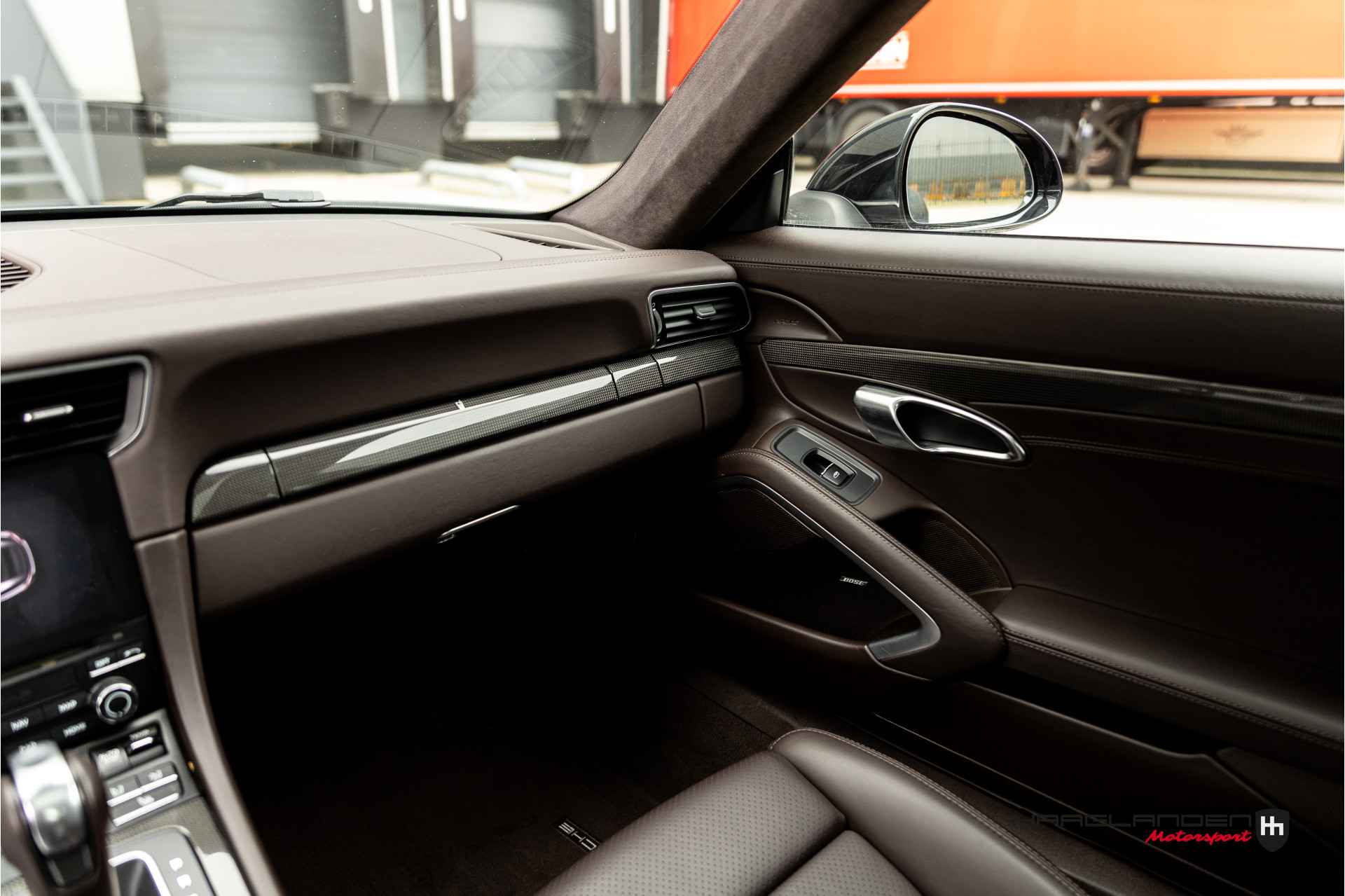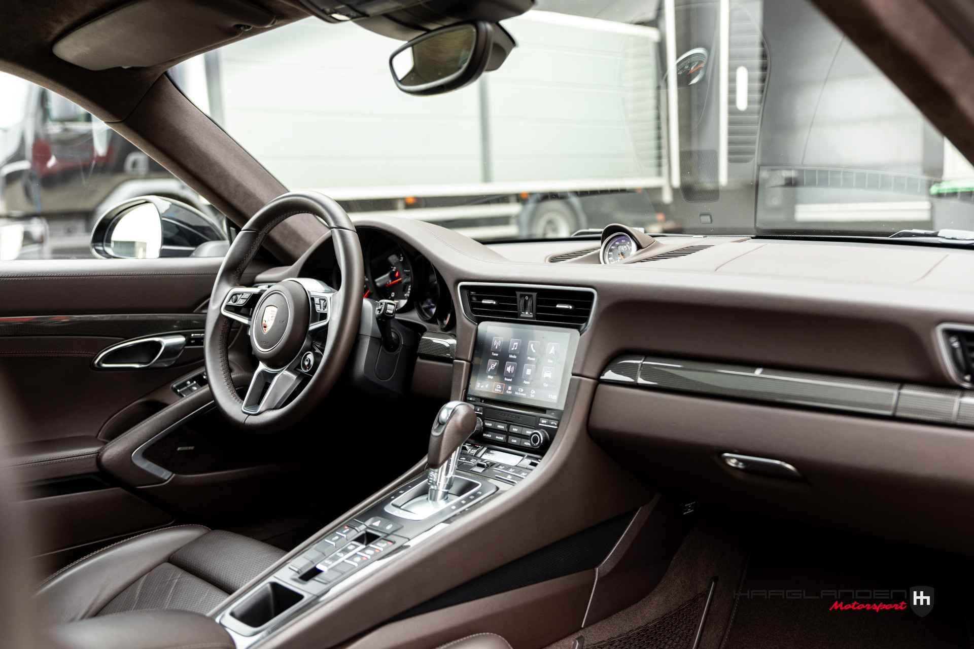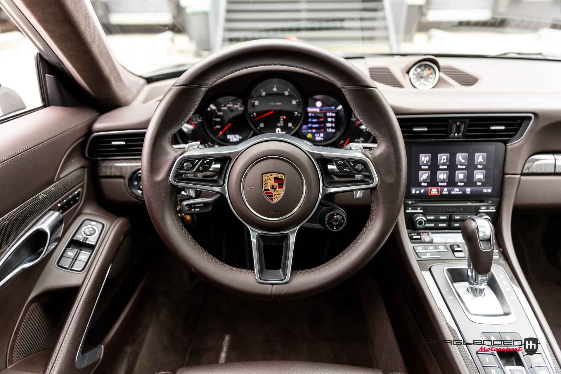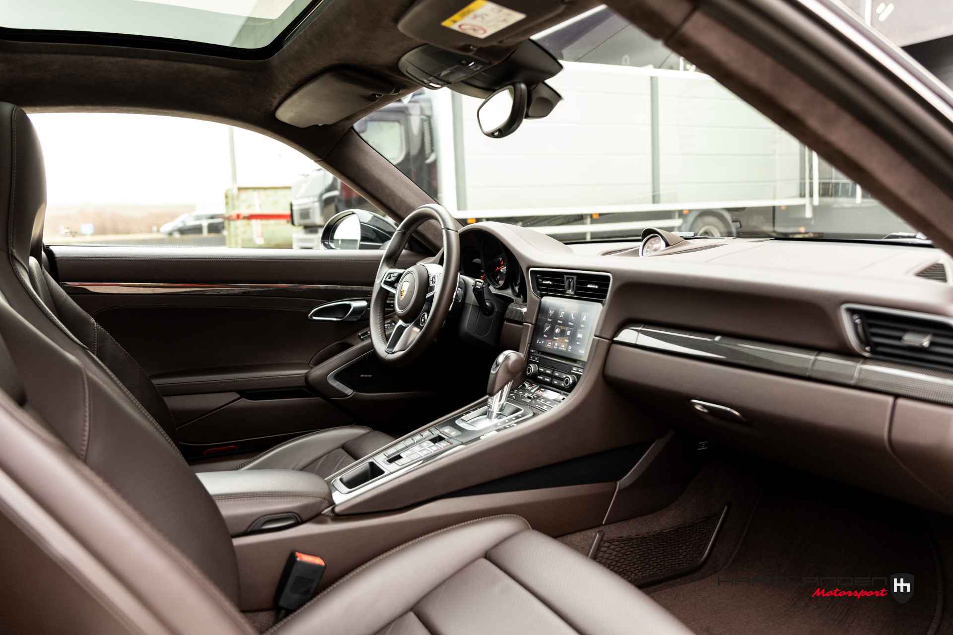 Het luxe bruine lederen interieur contrasteert prachtig met het donkere exterieur en is dankzij het gebruik van fijne materialen een prettige plek om te zijn. Zowel bij sportief als normaal gebruik zitten de meervoudige elektrisch verstelbare sportstoelen, die verwarmbaar zijn heerlijk en is elke rit aangenaam om de 3,0 liter 6-cilinder boxermotor met een lekkere roffel wakker te schudden. Het geluid doet meteen vermoeden dat de 370 pk’s en 450 Newtonmeters jouw met geweld in de stoel drukken wanneer het gas erop gaat. Inderdaad, een perfecte zitpositie is een absolute must in plaats van luxe. Uiteraard zijn er ook vele opties aanwezig die via knoppen of het touch screen te bedienen zijn. Climate control bijvoorbeeld, maar ook een geweldig Bose surround sound audio systeem voor de beste muziekkwaliteit. Verder heb je de beschikking over DAB+, full map navigatie en boordcomputer. Het lederen sportstuur met schakelflippers is voorzien van sportplus knop waarmee de 911 veranderd van luxe Gran Tourer naar pure sportwagen door de schokdempers strakker af te stellen, sportuitlaat te openen en gasrespons plus stuurinput aan te scherpen.
