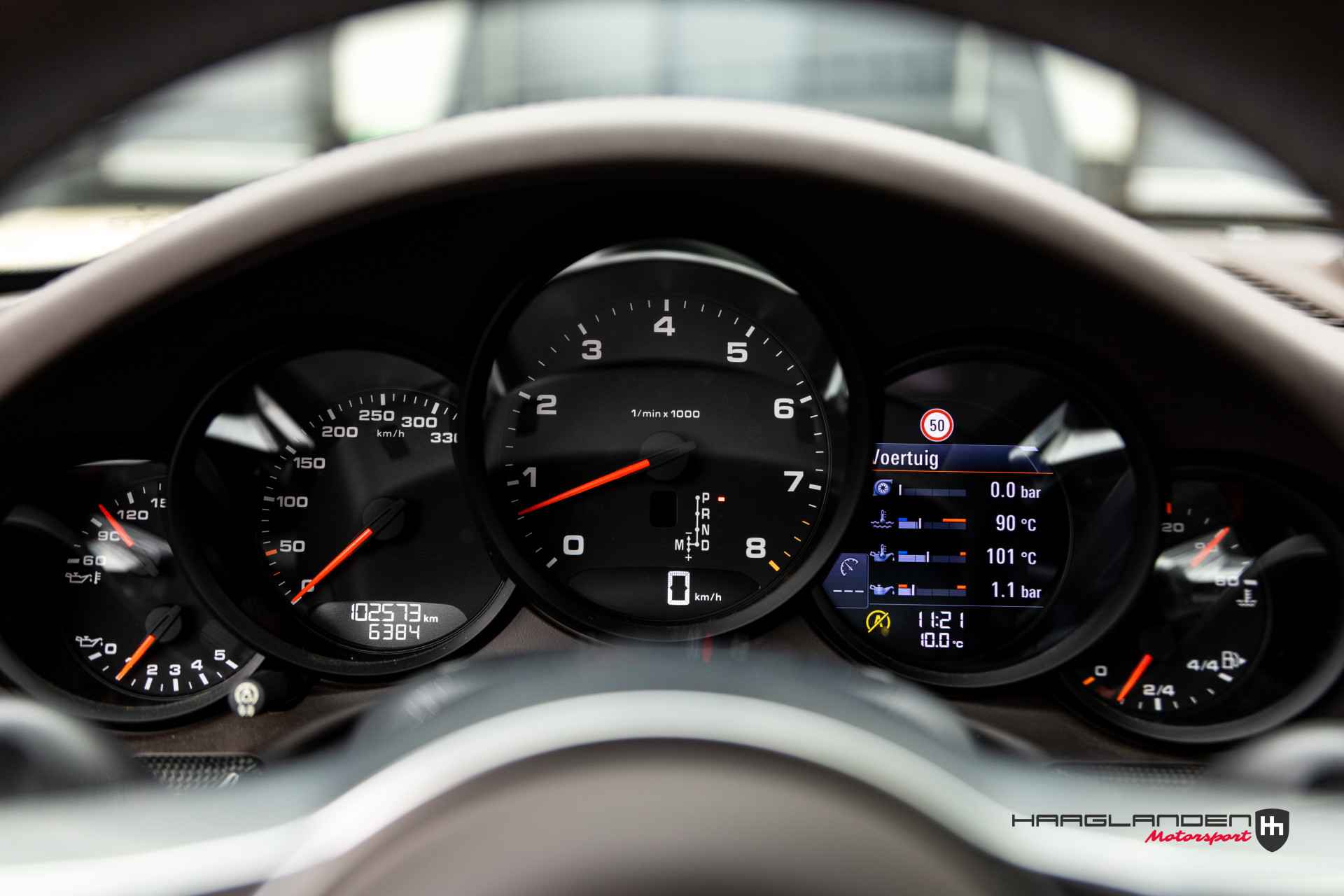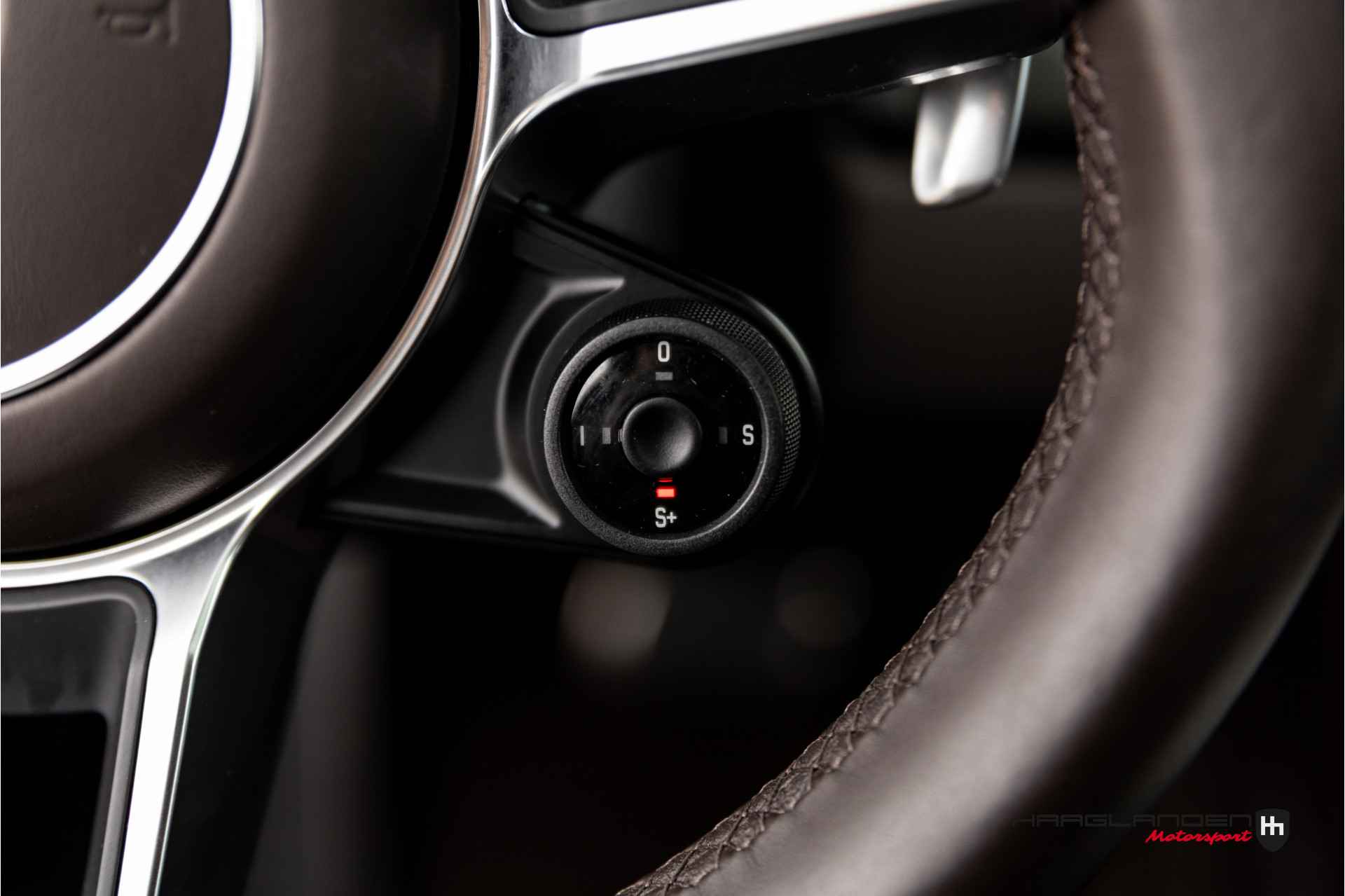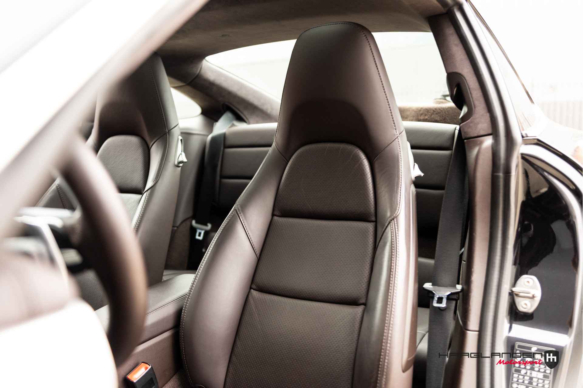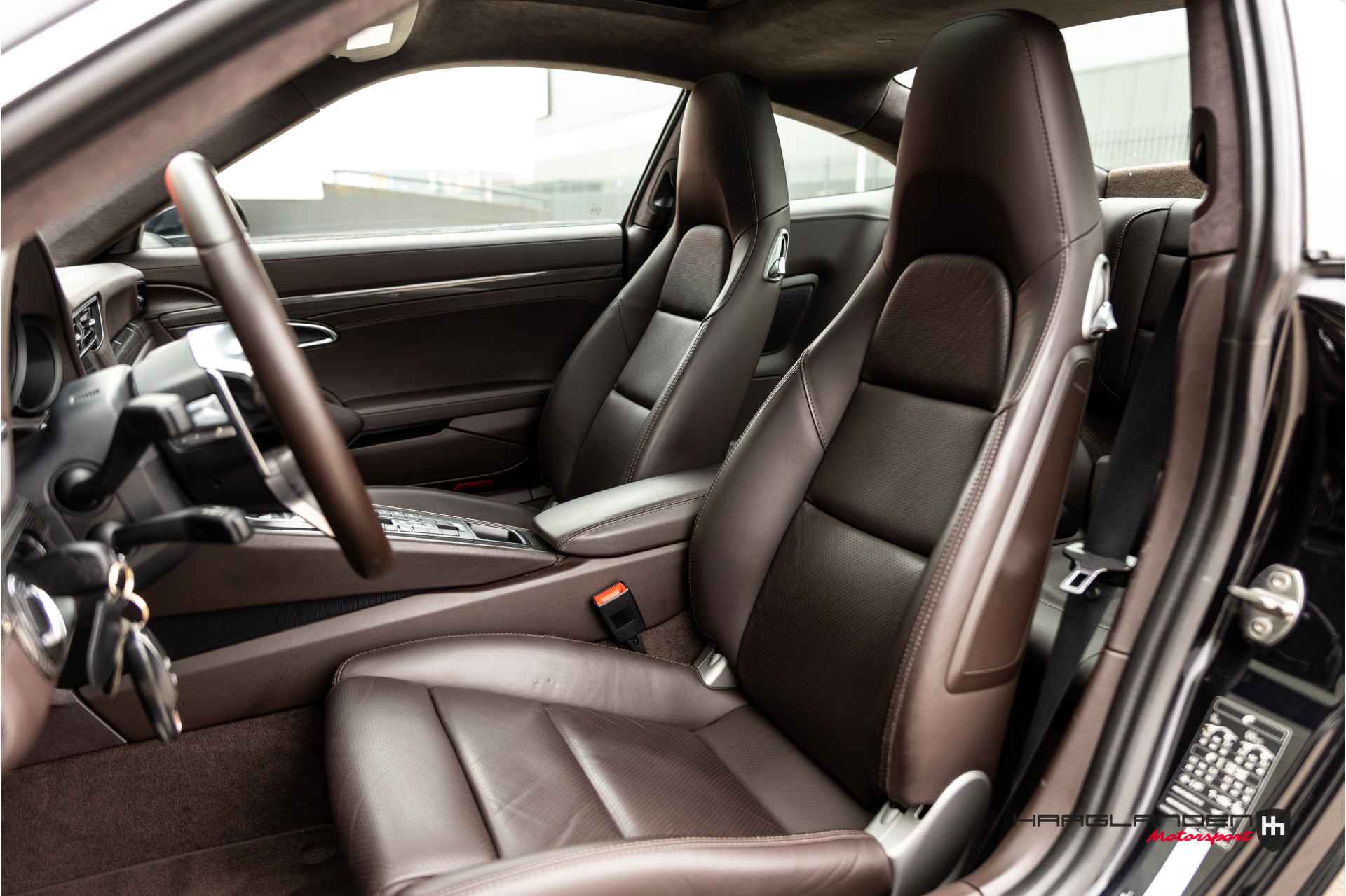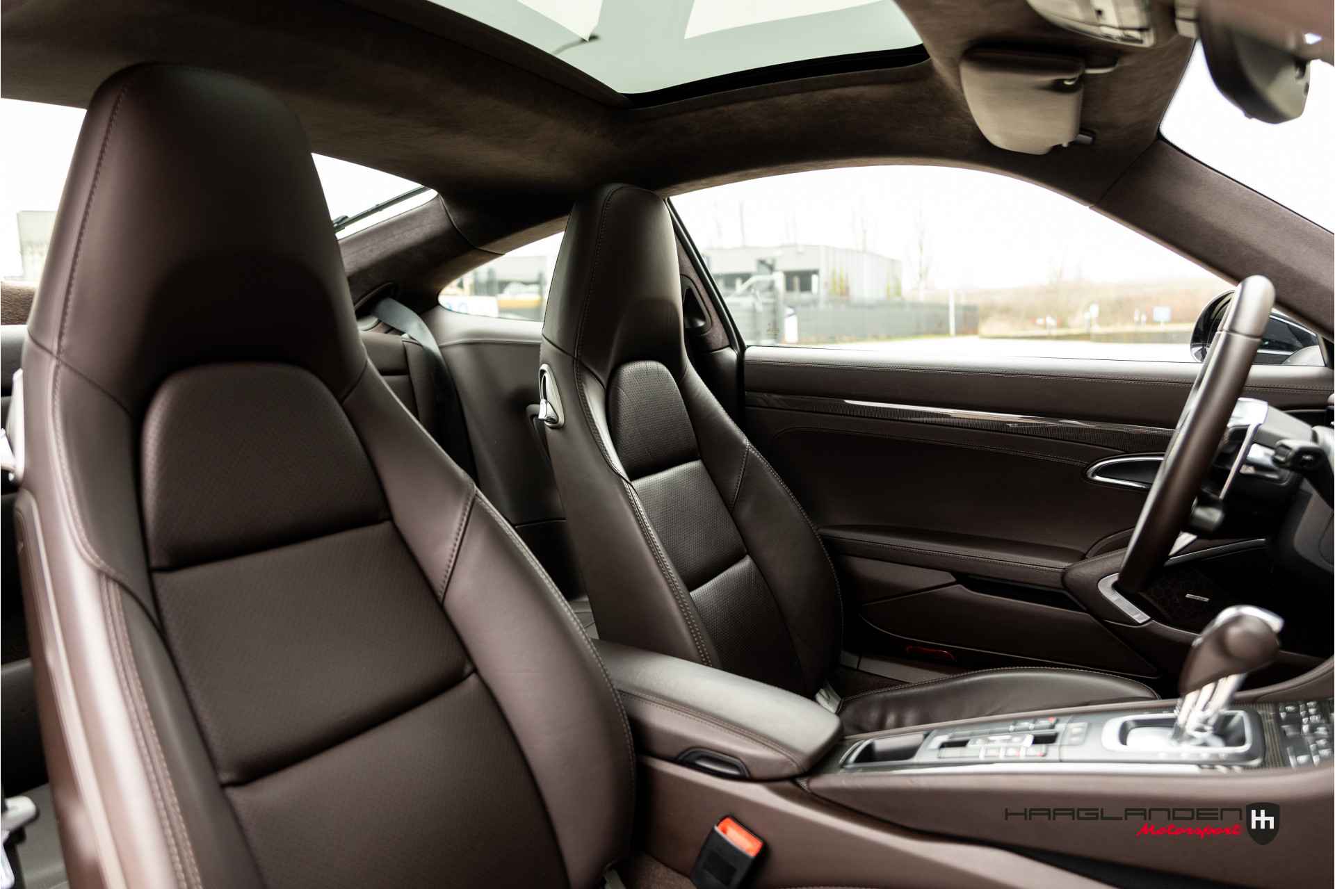 Het luxe bruine lederen interieur contrasteert prachtig met het donkere exterieur en is dankzij het gebruik van fijne materialen een prettige plek om te zijn. Zowel bij sportief als normaal gebruik zitten de meervoudige elektrisch verstelbare sportstoelen, die verwarmbaar zijn heerlijk en is elke rit aangenaam om de 3,0 liter 6-cilinder boxermotor met een lekkere roffel wakker te schudden. Het geluid doet meteen vermoeden dat de 370 pk’s en 450 Newtonmeters jouw met geweld in de stoel drukken wanneer het gas erop gaat. Inderdaad, een perfecte zitpositie is een absolute must in plaats van luxe. Uiteraard zijn er ook vele opties aanwezig die via knoppen of het touch screen te bedienen zijn. Climate control bijvoorbeeld, maar ook een geweldig Bose surround sound audio systeem voor de beste muziekkwaliteit. Verder heb je de beschikking over DAB+, full map navigatie en boordcomputer. Het lederen sportstuur met schakelflippers is voorzien van sportplus knop waarmee de 911 veranderd van luxe Gran Tourer naar pure sportwagen door de schokdempers strakker af te stellen, sportuitlaat te openen en gasrespons plus stuurinput aan te scherpen.
