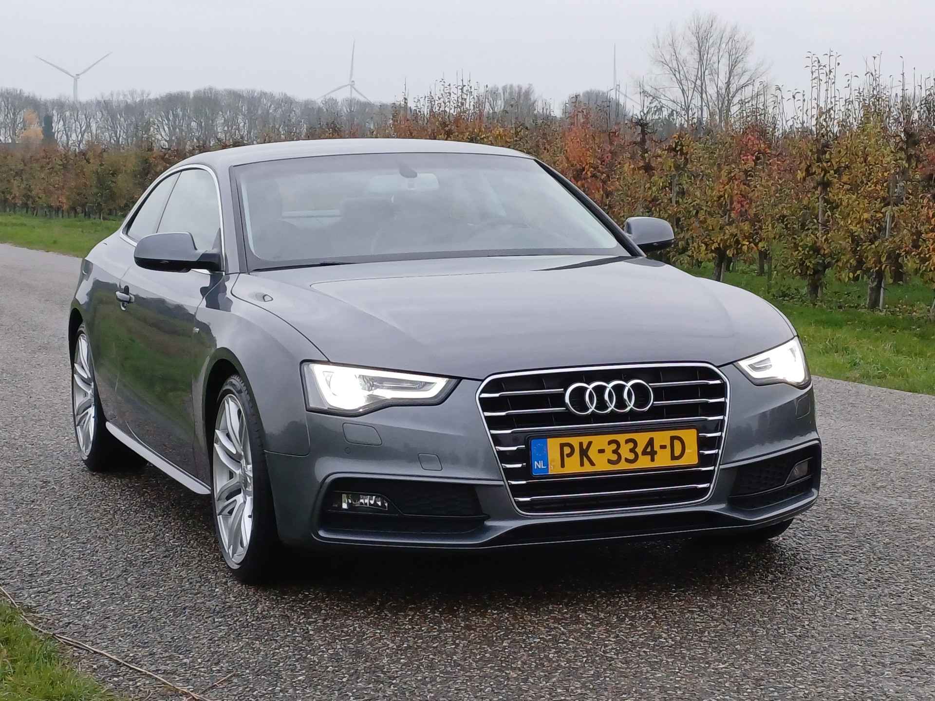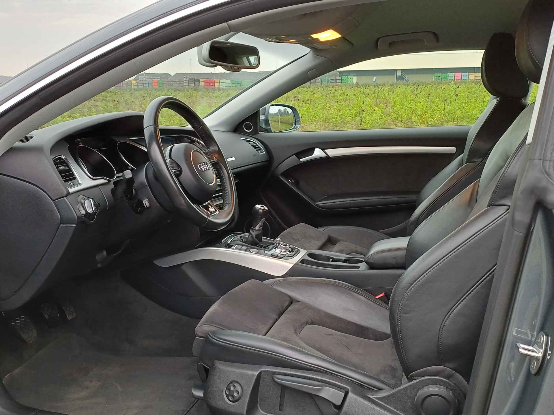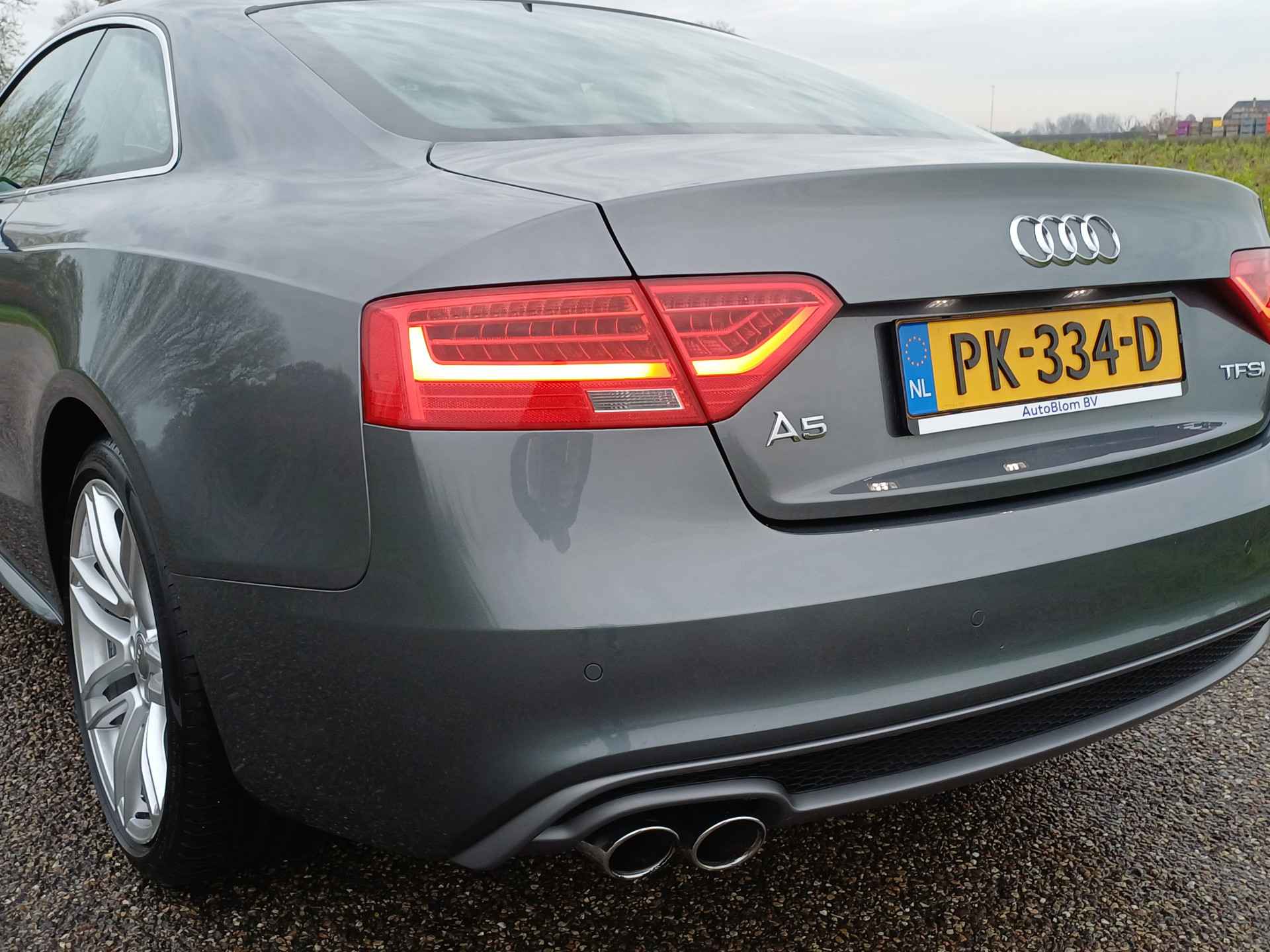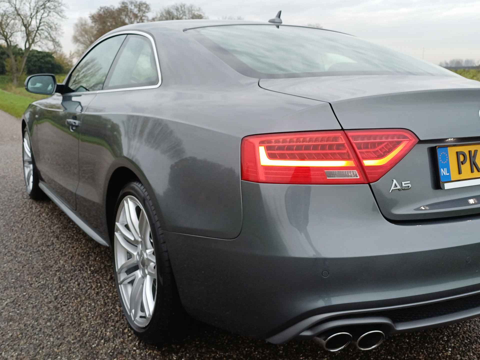 Let op! Trekhaak niet aanwezig. Kan geleverd en gemonteerd worden voor een meerprijs van Euro 875,-. De Audi A5 Coupé combineert comfort met een uitstekende wegligging en dynamische rijkwaliteiten. S-Line styling vertegenwoordigt de overtreffende trap in smaakvolle sportiviteit. Hij heeft een benzinemotor en een handgeschakelde zesversnellingsbak. Tijdens gure dagen is het prettig zitten in de verwarmbare voorstoelen. U blijft ook in de scherpe bochten goed ondersteund door de fraaie sportstoelen. De gasontladingslampen van de xenonverlichting zorgen voor een krachtige en heldere lichtbundel. In deze Audi profiteert u onder andere ook van: 19 inch lichtmetalen velgen, sportonderstel, halflederen bekleding, adaptief dempingsysteem en verstelbare lendensteunen.