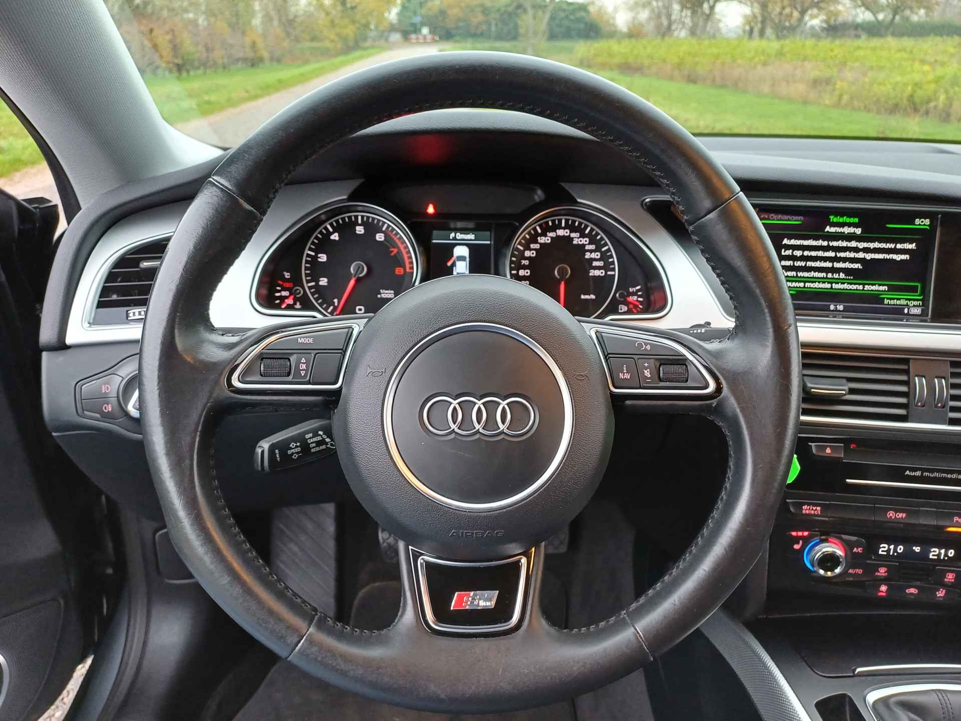 De auto is voorzien van een trekhaak en is een uitstekende caravantrekker. Muziek luisteren wordt genieten met het high performance audiosysteem. De automatische airconditioning zorgt onder alle omstandigheden voor een prettige temperatuur. Kom-maar-kom-maar...ho! Zo eenvoudig is het voordeel van parkeersensoren. En zo behulpzaam! Achter het stuur van deze Audi bent u niet alleen. De auto kijkt als het ware met u mee tijdens de rit. De regensensor schakelt de ruitenwissers in als het nodig is en de automatisch inschakelbare verlichting doet de lichten voor u aan. De Audi is standaard voorzien van: navigatiesysteem met harde schijf, digitale radio, cruise control, keyless entry, automatisch dimmende binnenspiegel en lederen stuur.