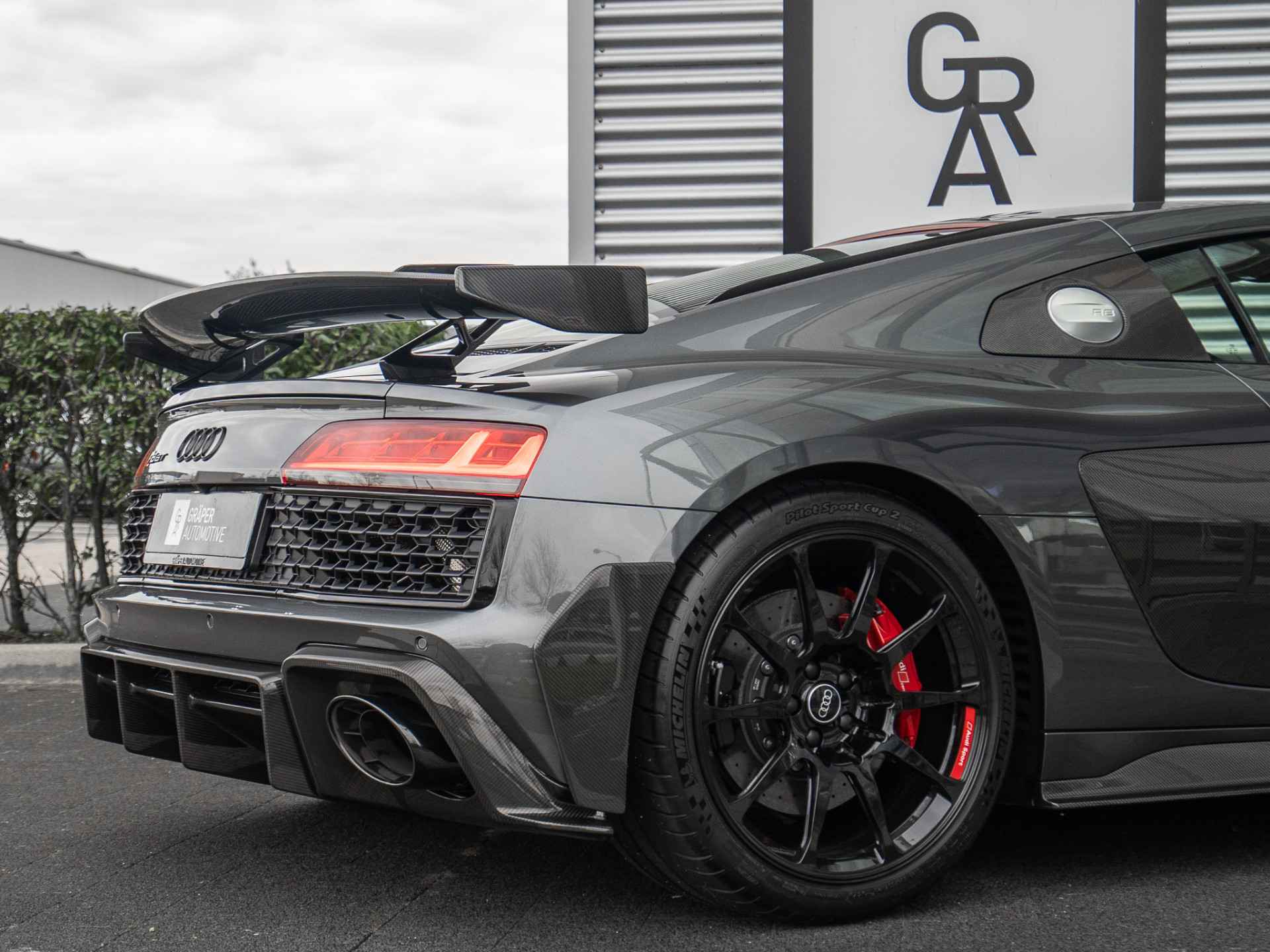 Een zéér nette en exclusieve Audi R8 V10 RWD GT uitgevoerd in Daytonagrijs pareleffect gecombineerd met het carbon GT PERFORMANCE exterieurpakket bestaande uit o.a. een Carbon Frontsplitter, Carbon Sideblades, Carbon achterspoiler en een Carbon Diffusor. Verder is deze auto onder andere voorzien van een Bang & Olufsen Soundsysteem, 20 inch ultra-lichtmetalen velgen, Parkeersensoren voor en achter i.c.m. achteruitrijcamera, Keramische remmen en Audi GT inlegdelen in het interieur. Uniek aan deze auto is ook het 3 weg instelbare AUDI SPORT race onderstel.