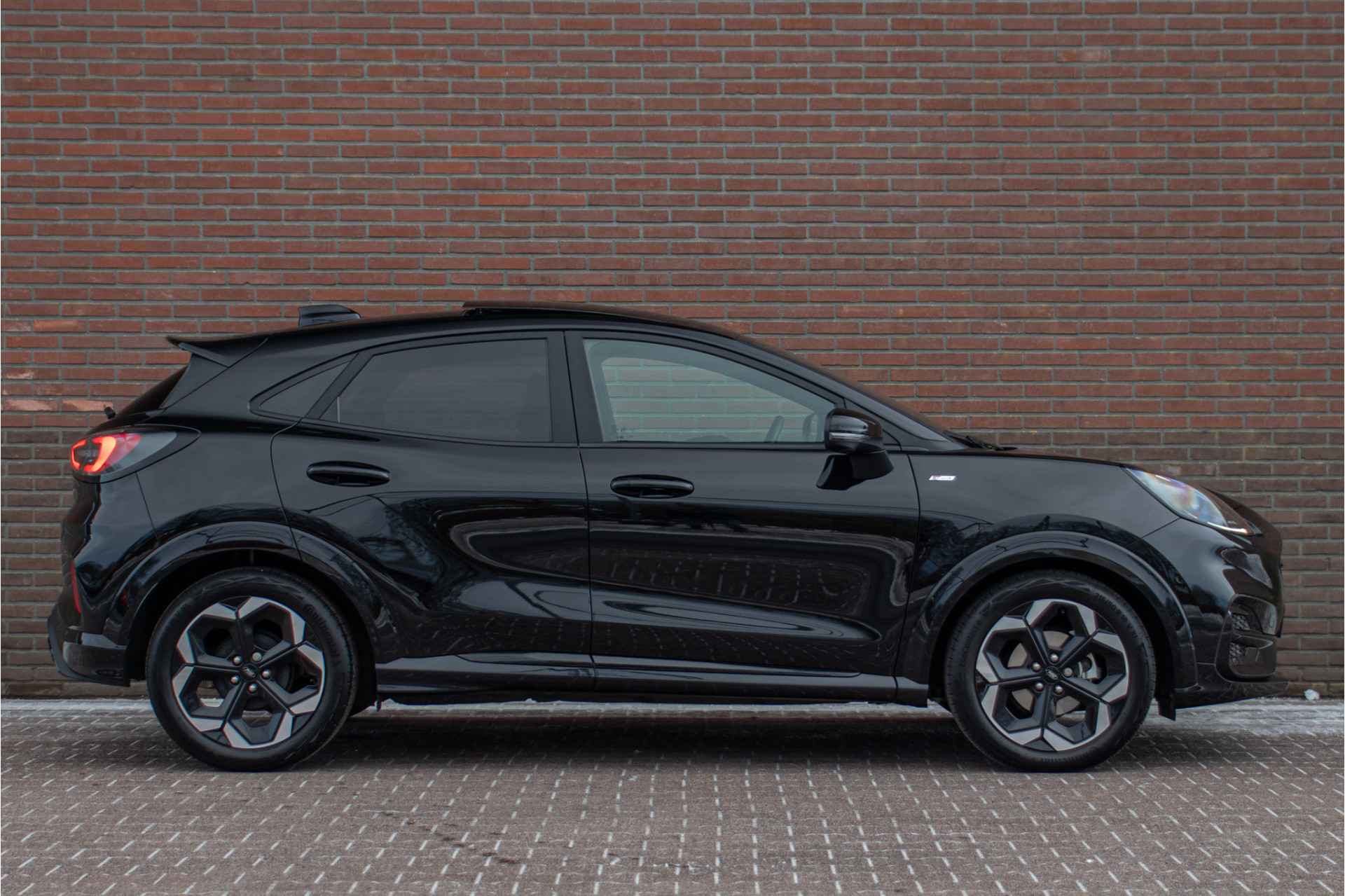 De Puma kreeg in 2024 een uitgebreide facelift en dit exemplaar is één van de eerste hiervan geleverd. Je herkent deze aan het nieuwe Ford-logo en het vernieuwde front-design, maar vooral aan het herziene dashboard met het grote instrumentenpaneel en middenscherm.