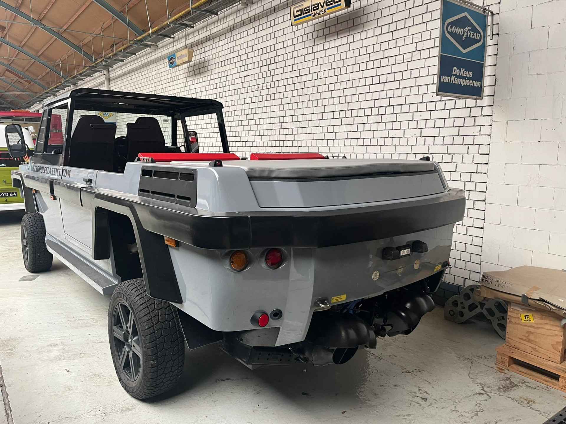This machine is orginal built by gibbs, and is only factory hours and testing, we made extra special seats for it, it has bluetooth radio system, and extr option sliding windows for the cabine, brandnew in the box. The car has european ( german) papers. and dutch water registration.