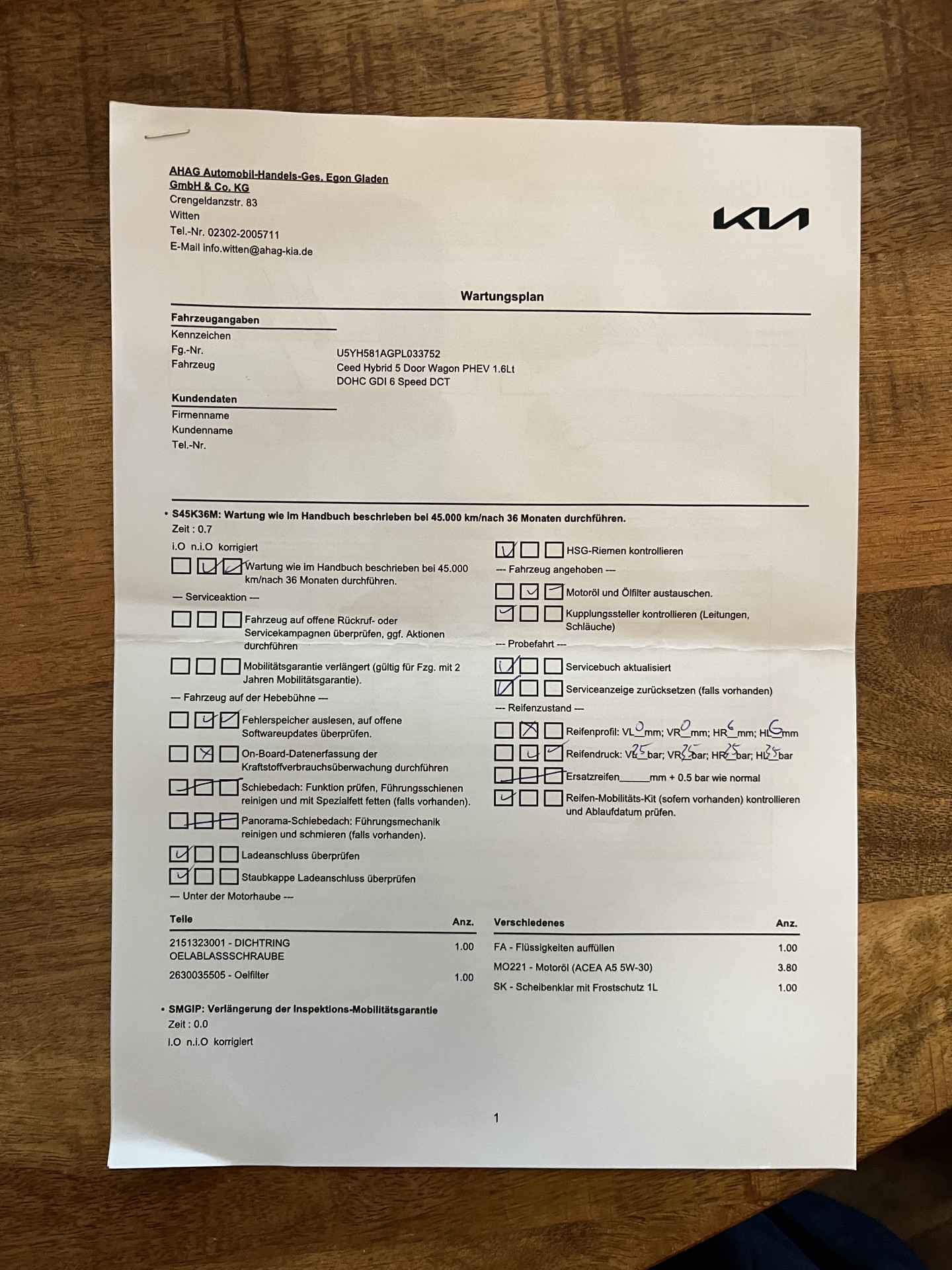onderhoudsgegevens en twee sleutels.