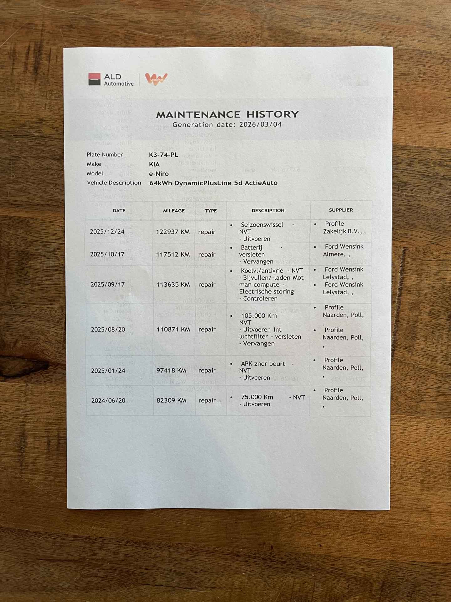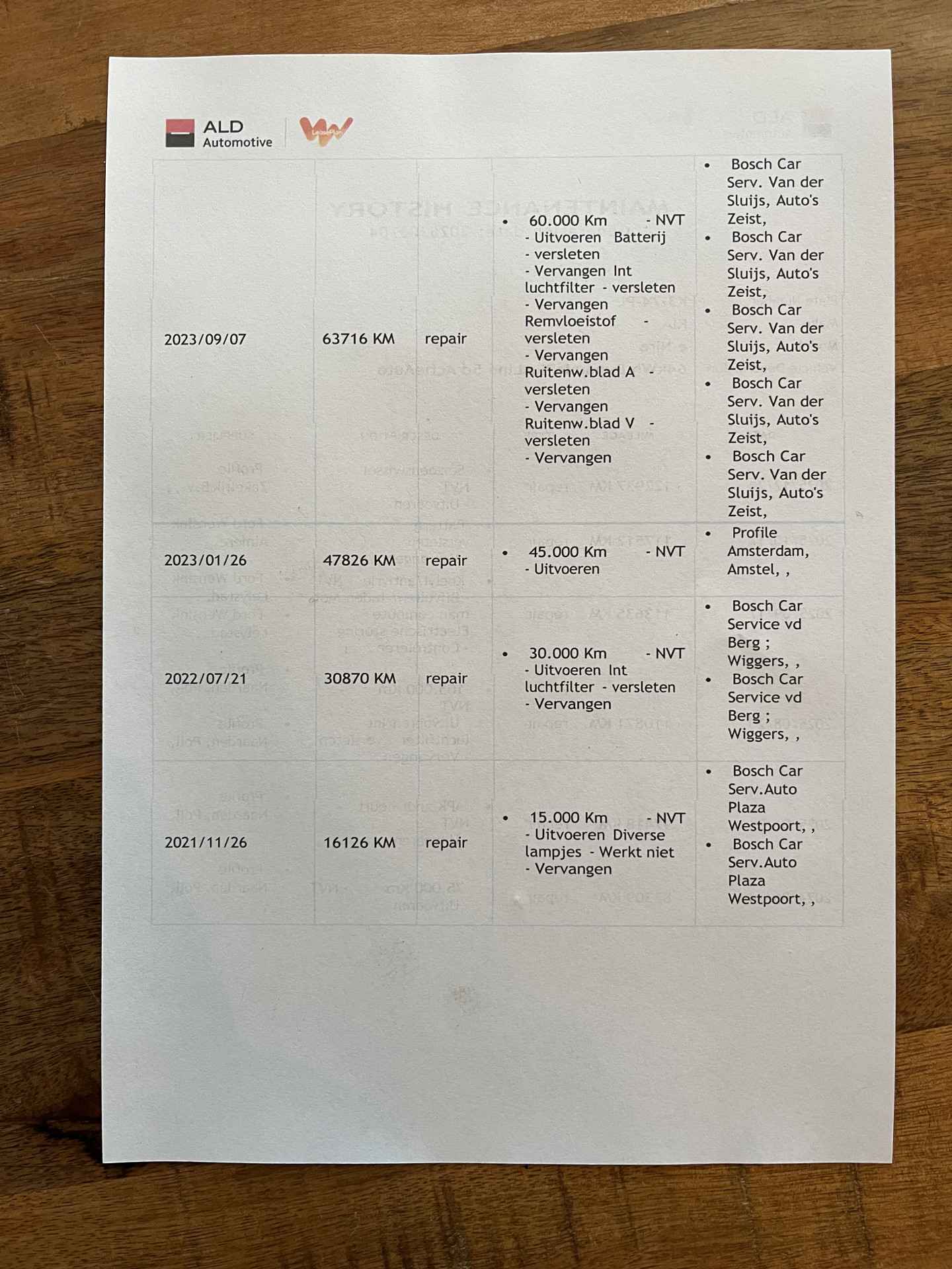 logische Nationale Auto Pas, onderhoudshistorie