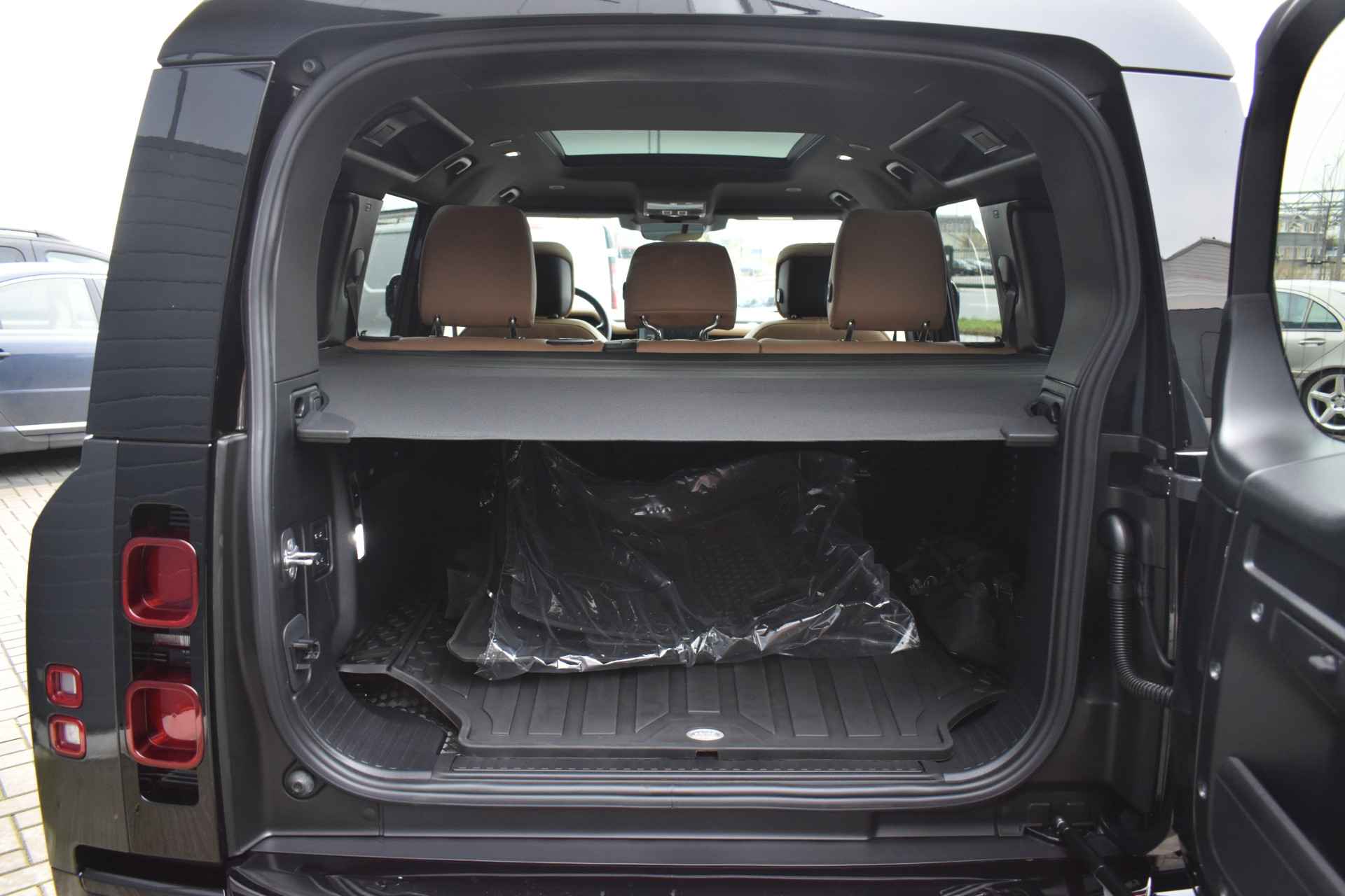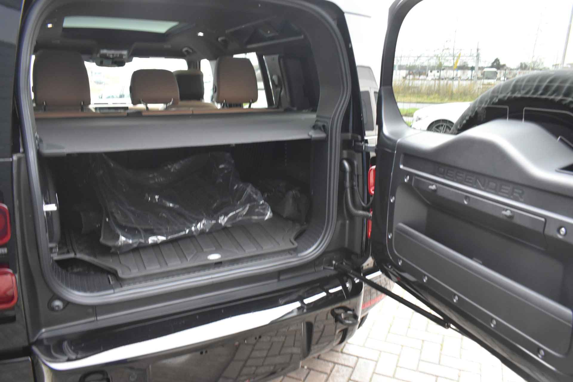 022 BG 3 Zonen Climatronic 022 FA Luchtkwaliteit sensor 022 GH Luchtkwaliteit Plus voor interieur 025 CT Garage deur opener[Homelink] 028 LD Trekhaak automatisch in – en - uitklapbaar 039 IB Head Up Display 045 CB Koelkast in middenconsole front 048 BD Instaplijsten voor portieren verlicht met Defender schrift 027 BI Winterpakket 032 DV Stuurwielverwarming 040 AK Voorruit verwarming 040 AQ Ruitensproeier reservoir verwarmd 064 BV Koplamp reiniging systeem 075 QD Uitgebreid Black Exterieur pakket 245 AD Langsdrager dashboard in Dark Grey, geborsteld donker grijs 328 AD Reservewiel afdekking 188 HD Ebony zwart hemelbekleding 070 BC Soft Close achterdeur 086 GP Surround camerasystem 087 AW11.4 Inch Touchscreen 031 SZ 22 Inch lichtmetalen Velgen Style 5098 in Gloss Black 028 ME Volwaardig reservewiel 22 inch 041 CZ Panorama Schuif kantel dak 079 AJ Luxe mattenset 000 00 Black Badge uitgevoerd VPLLE Matten set rubber met hoge zijkant VPLWS0475 Pedalenset aluminium