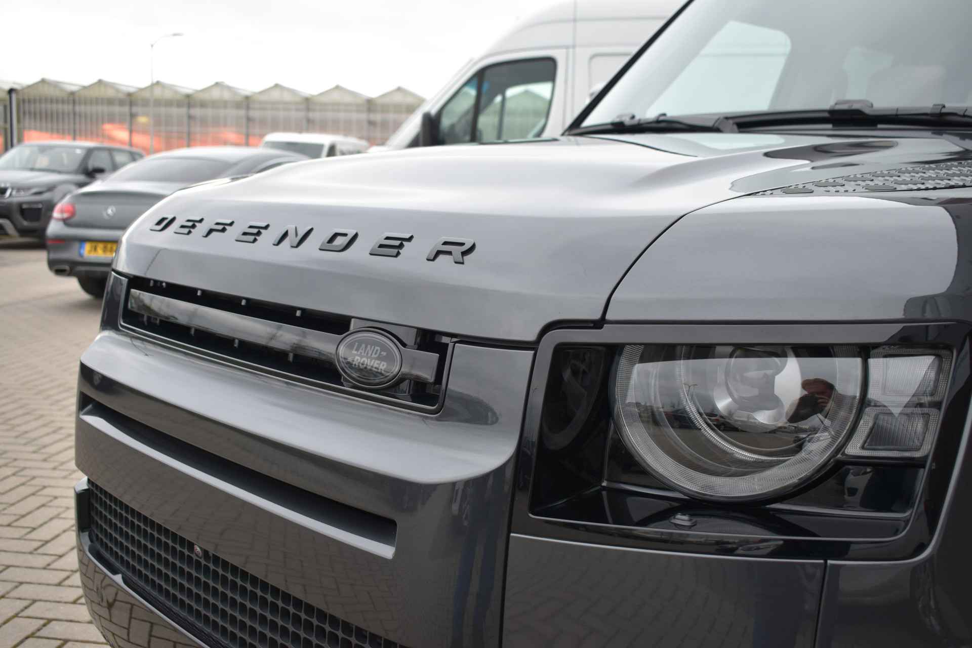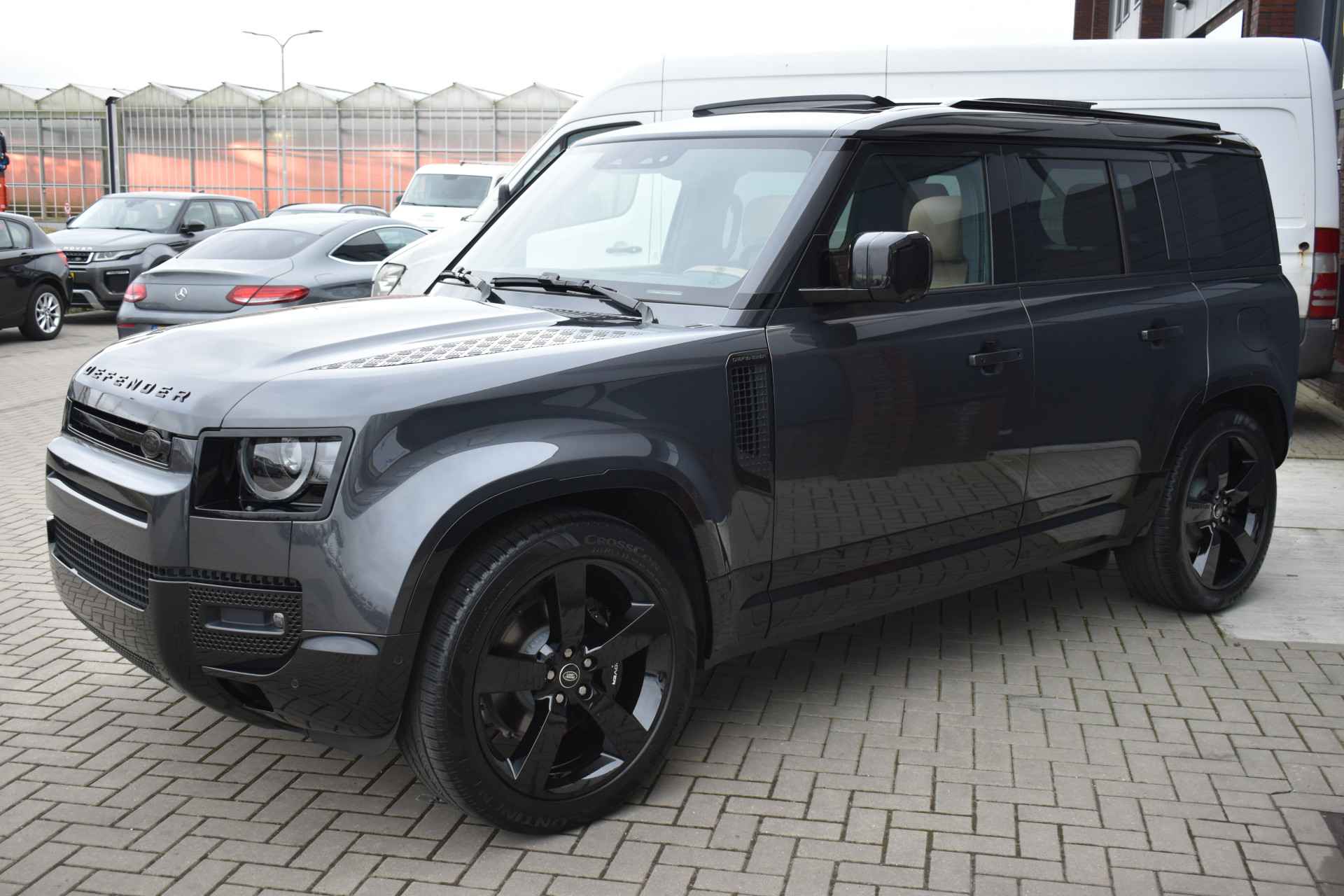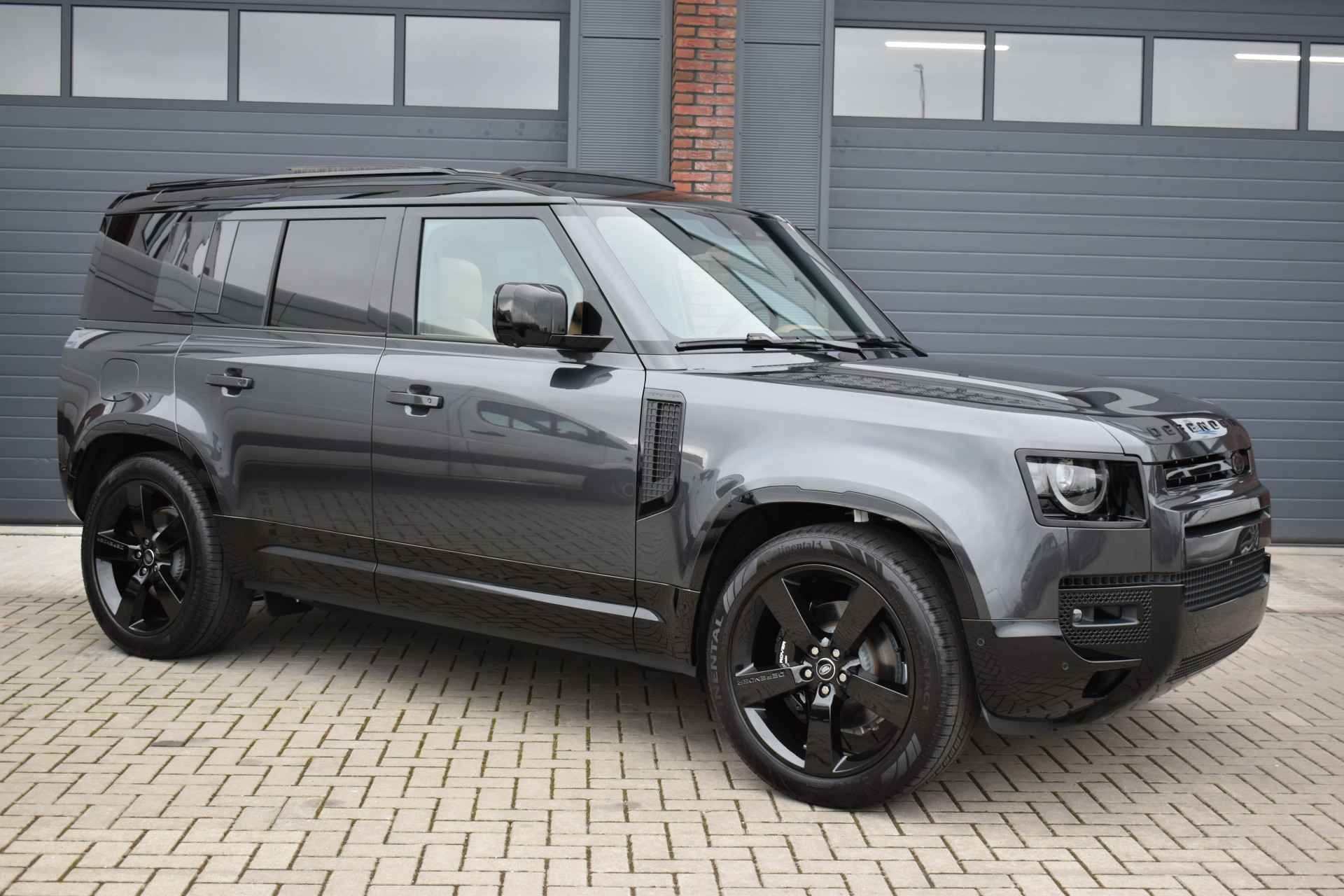 Prachtige combinatie: Carpathian Premium Grijs Metallic met Caraway-interieur. Door SV uitgevoerde Black Badge met zwarte remklauwen voorzien van Land Rover-opschrift. Volledig uitgeruste Defender, een absolute must-have voor liefhebbers!