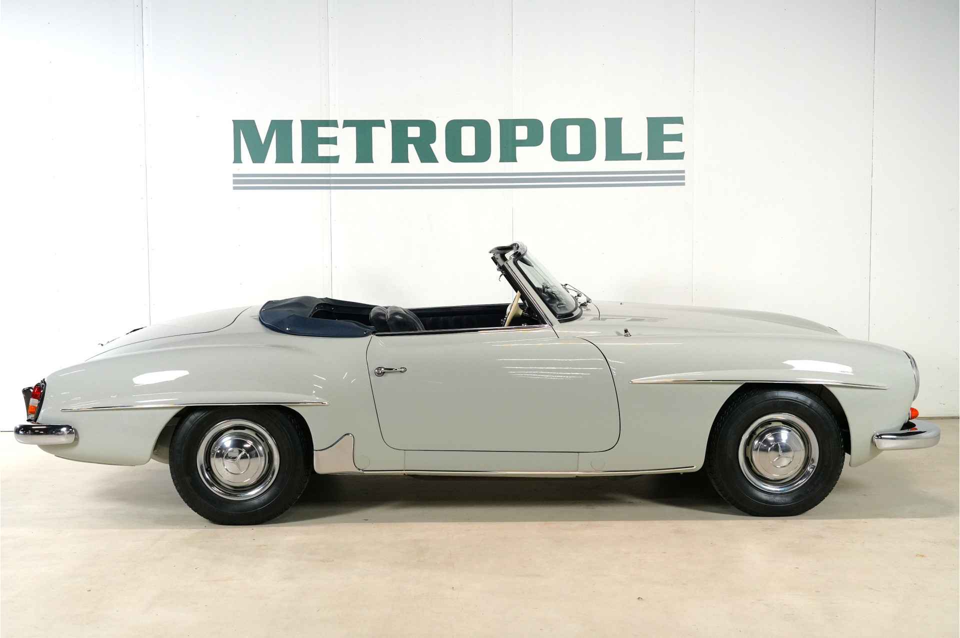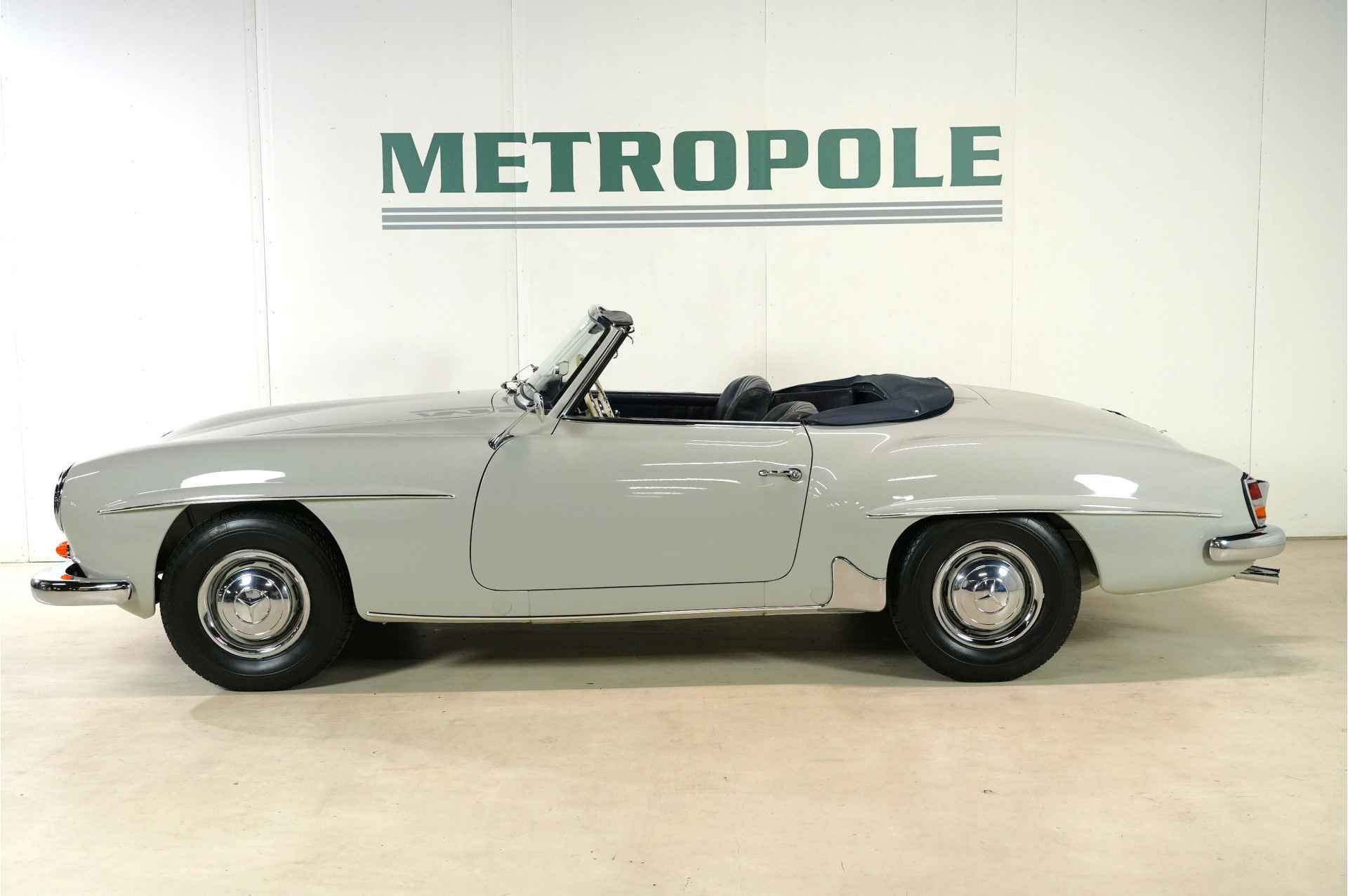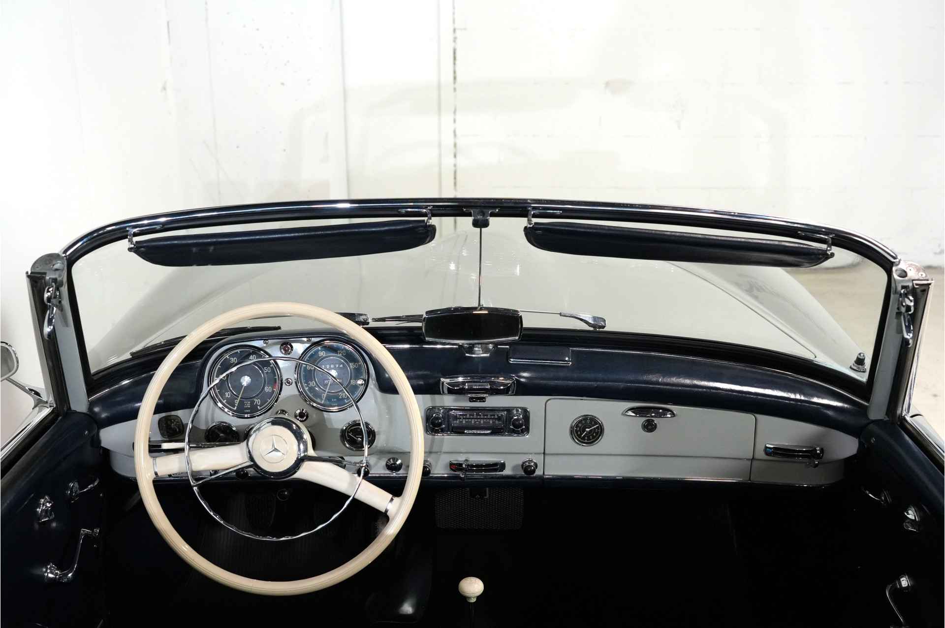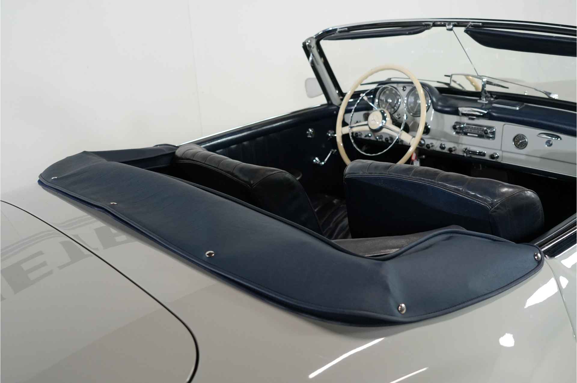 Dit is een Mercedes 190 SL van de eerste eigenaar, die de auto nieuw kocht toen hij 25 jaar oud was. Hij bestelde de auto met alle opties: elektrische antenne, derde stoel, Becker Mexico-radio, en hij liet de hardtop in de originele fabriekskist zitten. De kist heeft nog steeds de originele stickers en teksten van Mercedes. De hardtop is donkerblauw, wat prachtig combineert met de grijze carrosserie, het blauwe leer en de blauwe hardtop.