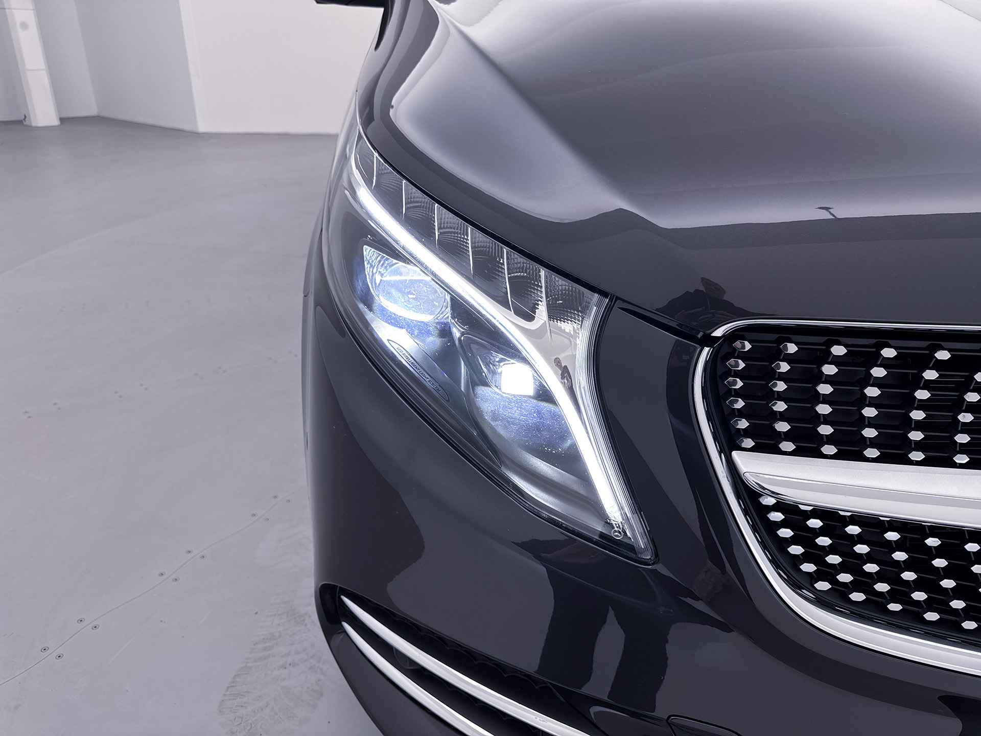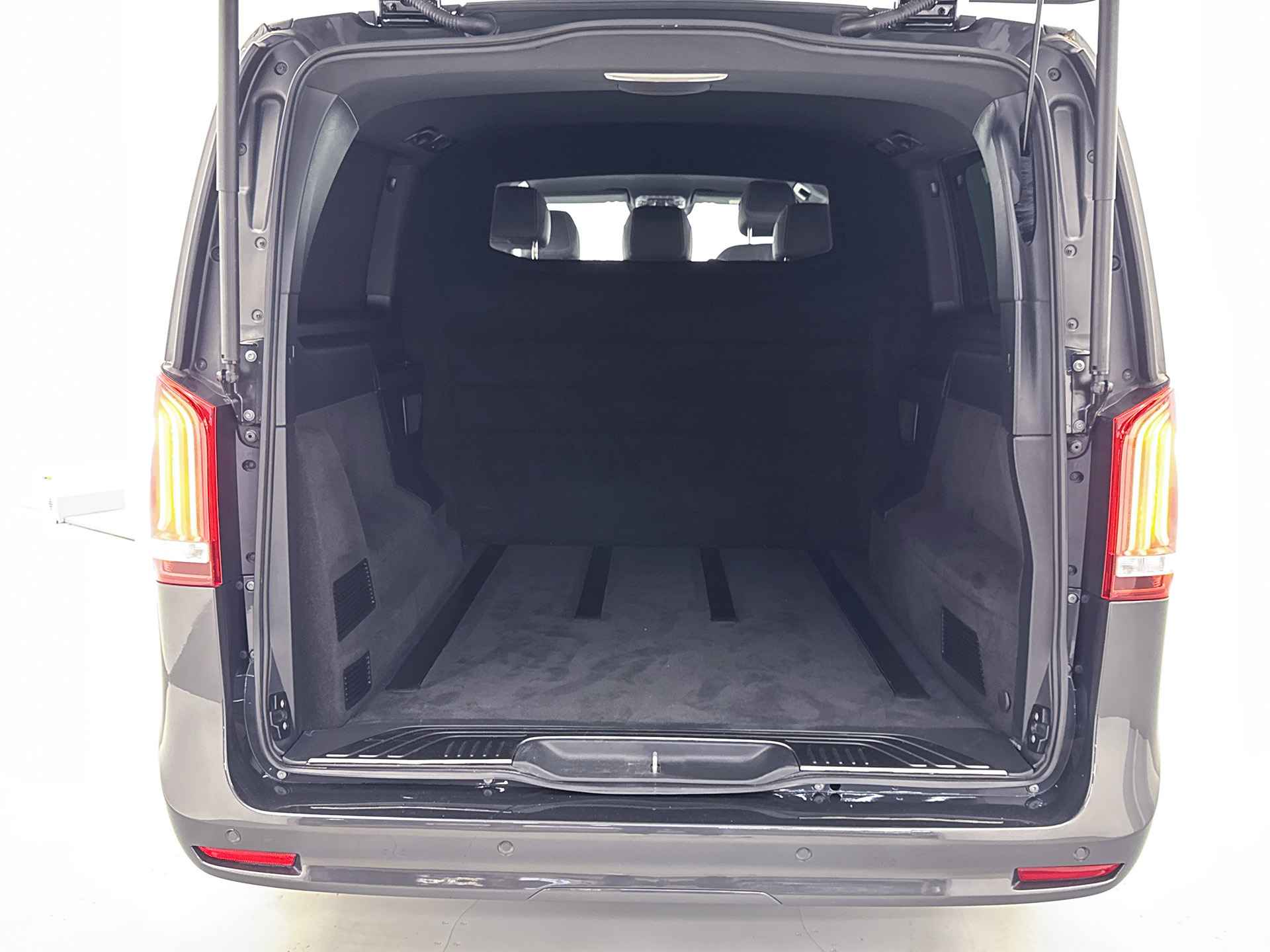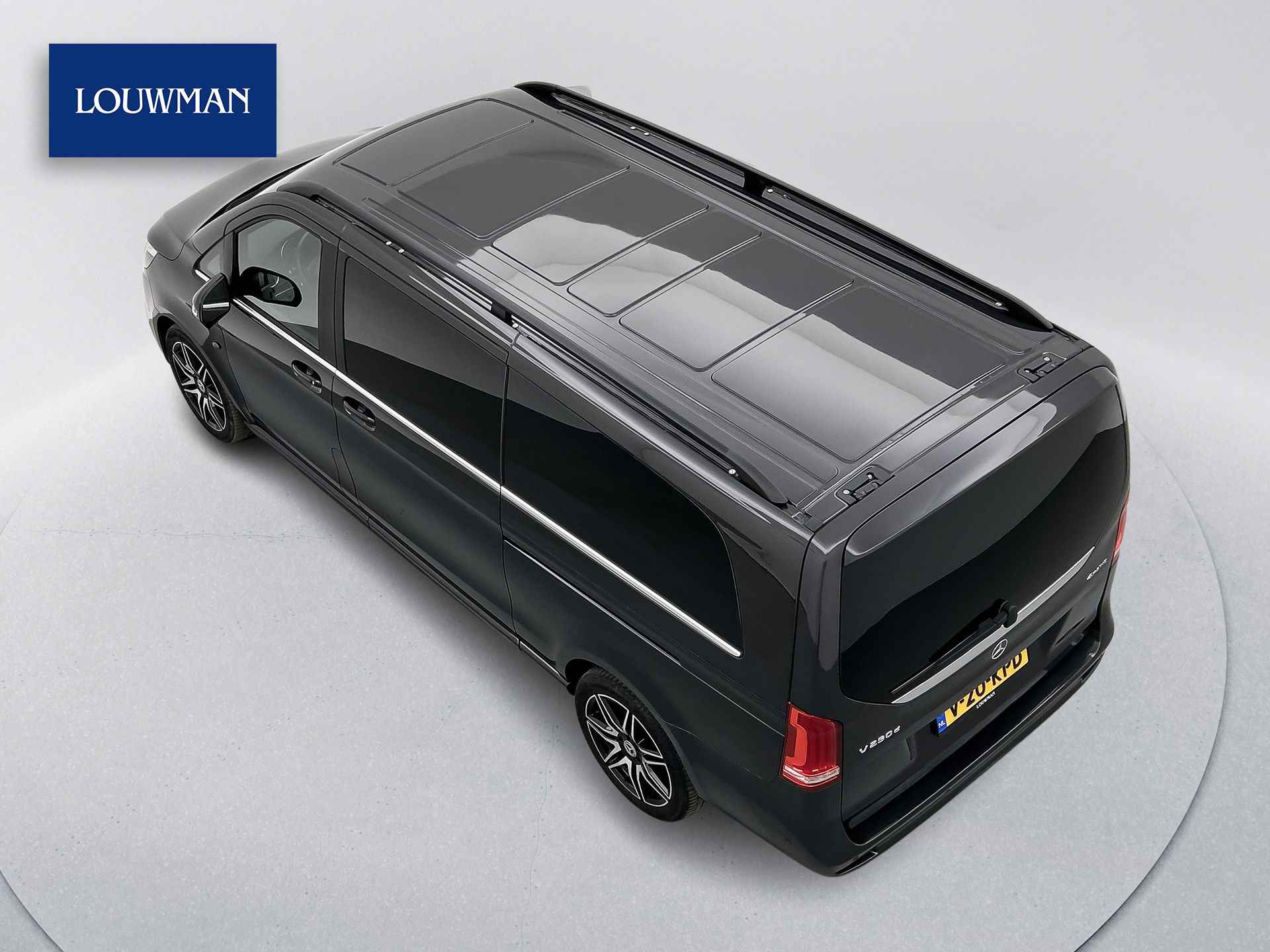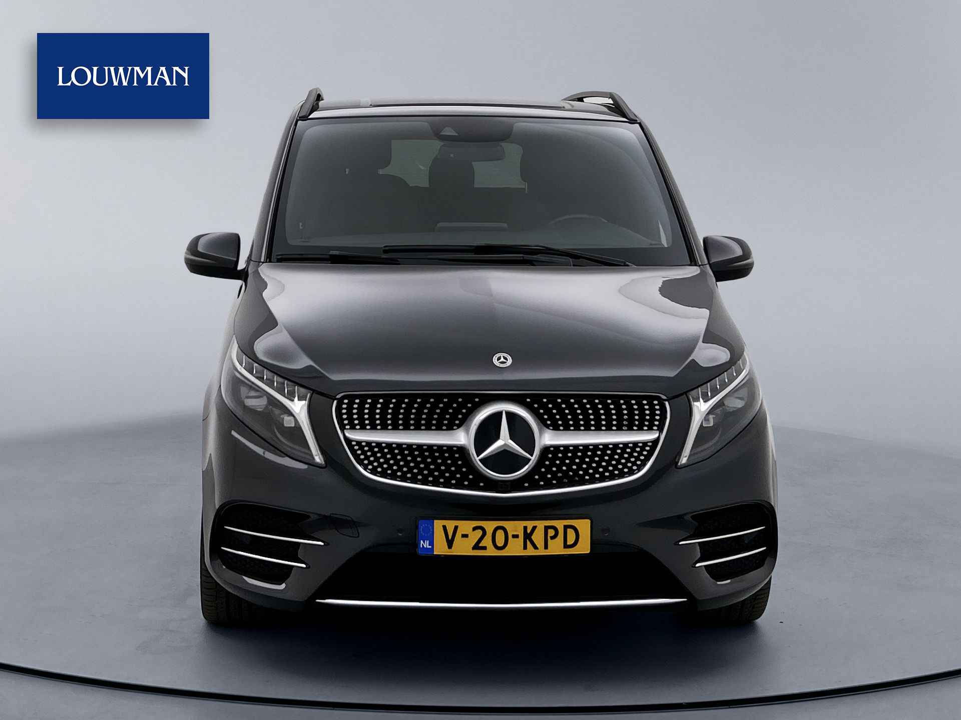Deze V-Klasse is uitgevoerd in stijlvol donker grijs metallic en voorzien van het AMG Styling-pakket, inclusief 19-inch lichtmetalen velgen en sportieve styling, wat zorgt voor een dynamische uitstraling.