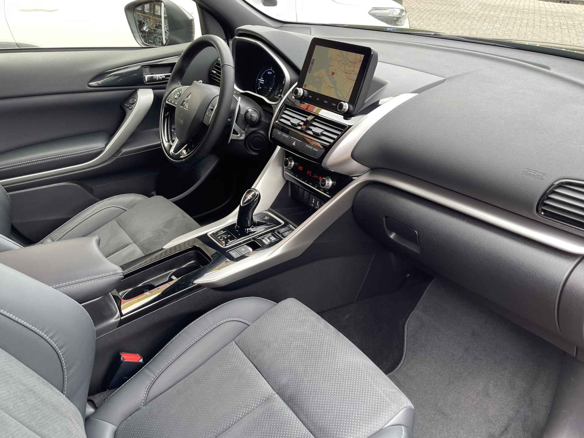 U gelooft het misschien moeilijk, maar deze Mitsubishi Eclipse Cross is niet nieuw. Nèt niet. De eerste eigenaar heeft 'm eventjes voor u ingereden en de nieuwprijs voor zijn rekening genomen. Nu is-ie voor u. Deze auto uit 2022 heeft nauwelijks gereden, met een tellerstand van slechts 15425 kilometer. Een krachtige viercilinder benzinemotor en een prettige automatische transmissie zorgen voor de aandrijving van deze stoere Mitsubishi. Boven uw hoofd schijnt de zon. Het licht valt binnen door het elektrisch bediende glazen panorama dak. En door het comfort van het lederen interieur geniet u van elke kilometer. U past de stoelen moeiteloos aan, ze zijn elektrisch in te stellen en hebben bovendien een geheugen. De behaaglijkheid van de verwarmde achterbank zal ook uw passagiers bevallen. Tot de uitrusting van deze Mitsubishi behoren ook 18 inch lichtmetalen velgen, LED koplampen, dakspoiler, donker getint glas achter, in delen neerklapbare achterbank en snelheidsafhankelijke stuurbekrachtiging.