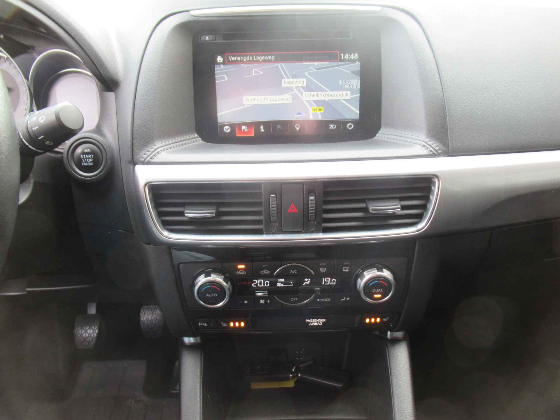 Zoals u mag verwachten van deze Mazda CX-5 is hij uitgerust met een reeks aan actieve veiligheidssystemen. Het Lane-keeping systeem registreert permanent of u binnen de lijnen van de rijstrook blijft; dwaalt u onbedoeld af, dan waarschuwt het systeem en corrigeert de koers. Heuvelop stilstaan was vroeger een kunstje. Met de hill hold control gaat het volautomatisch. Bovenop deze veiligheidsfeatures heeft deze Mazda bovendien dodehoekdetectie, autonoom remsysteem en bandenspanningcontrolesysteem.