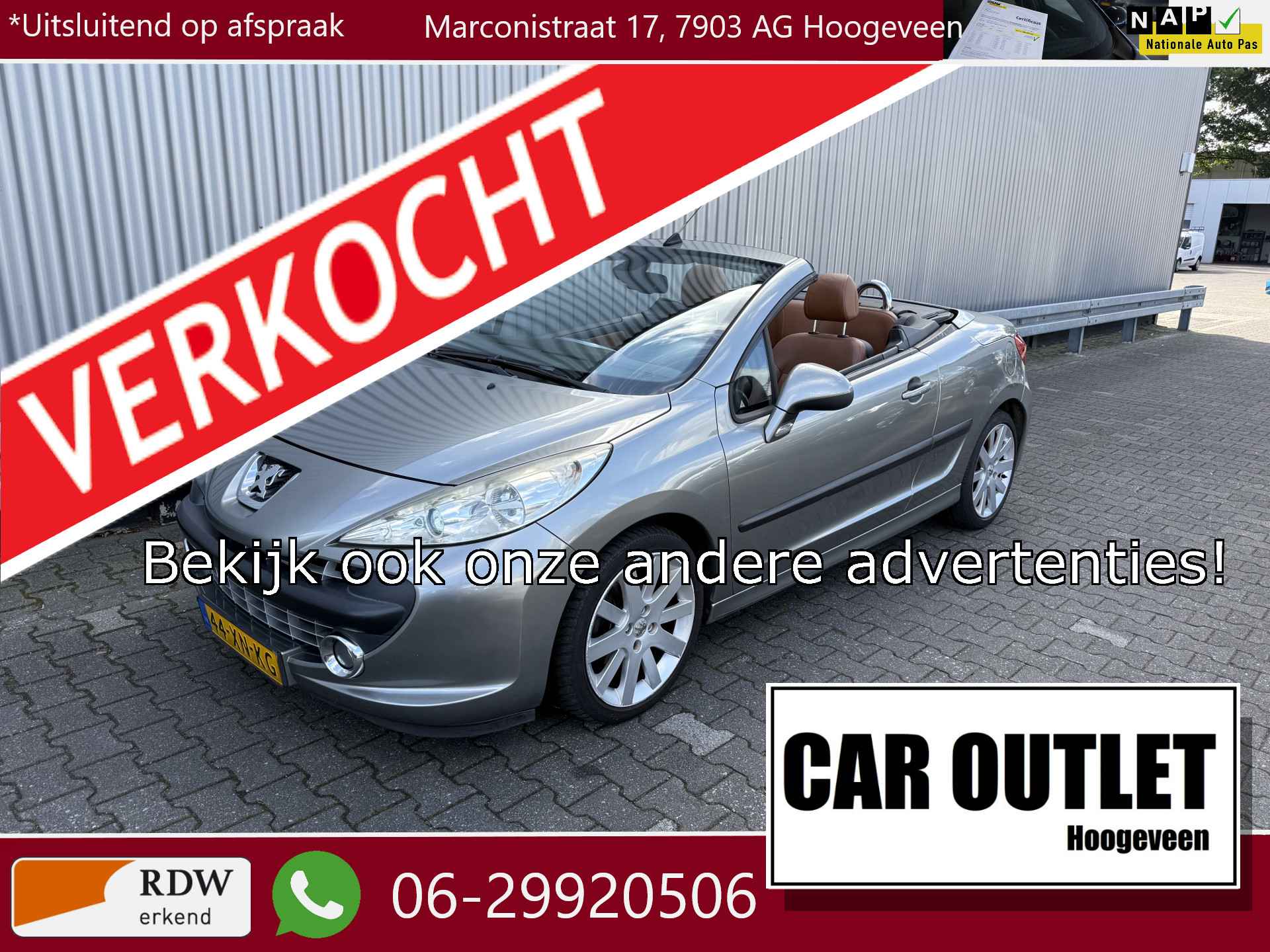 WIJ ZIJN ALLEEN OPEN OP TELEFONISCHE AFSPRAAK. Nette en goed rijdende Peugeot 207 CC 1.6 VTi Féline met o.a. Gescheiden individueel instelbare Klimaatregeling, Vol Lederen interieur, Cruise Control en Origineel Licht Metaal. Inruil is uiteraard bespreekbaar.