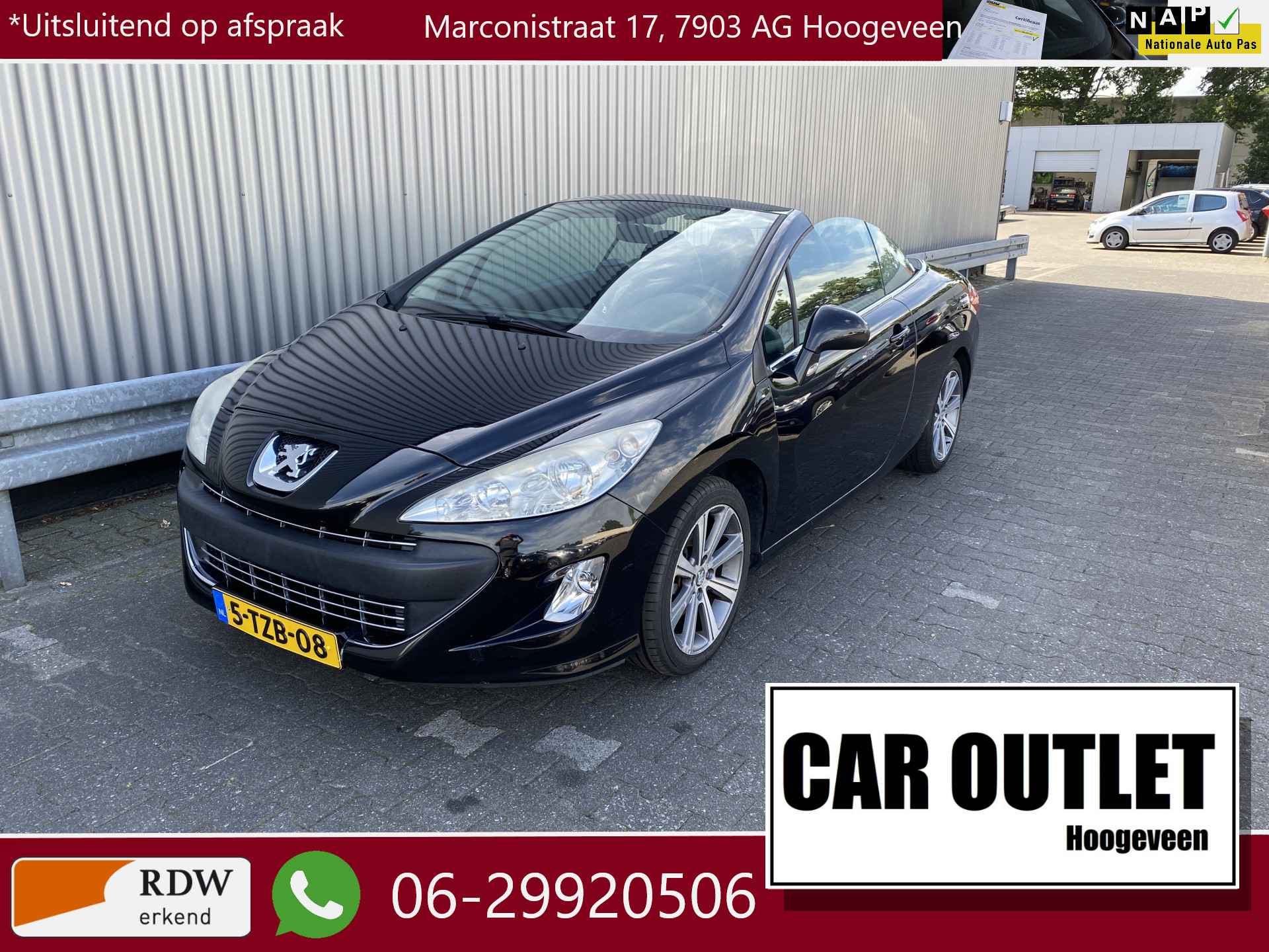 WIJ ZIJN ALLEEN OPEN OP TELEFONISCHE AFSPRAAK. Goed Rijdende Peugeot 308 CC 1.6 VTi Sport, slechts 123Dkm. op de klok en met o.a. Klimaatregeling, Bluetooth Carkit, Origineel Licht Metaal en nieuwe APK. Inruil is uiteraard bespreekbaar.