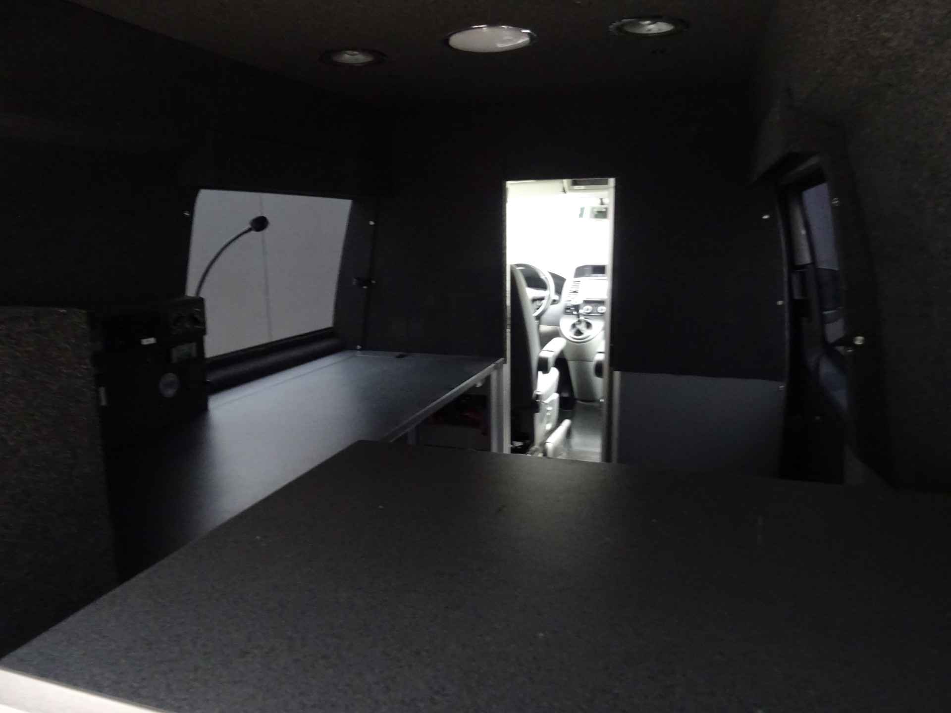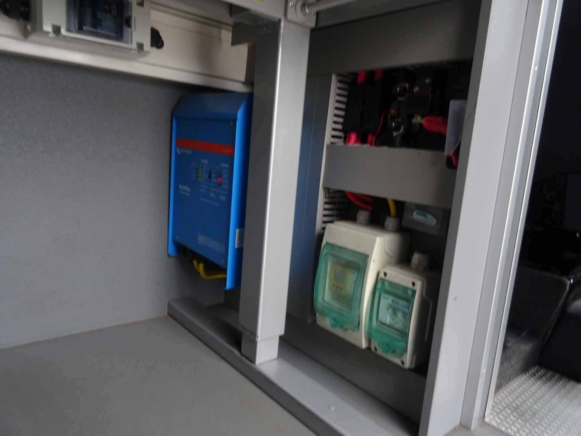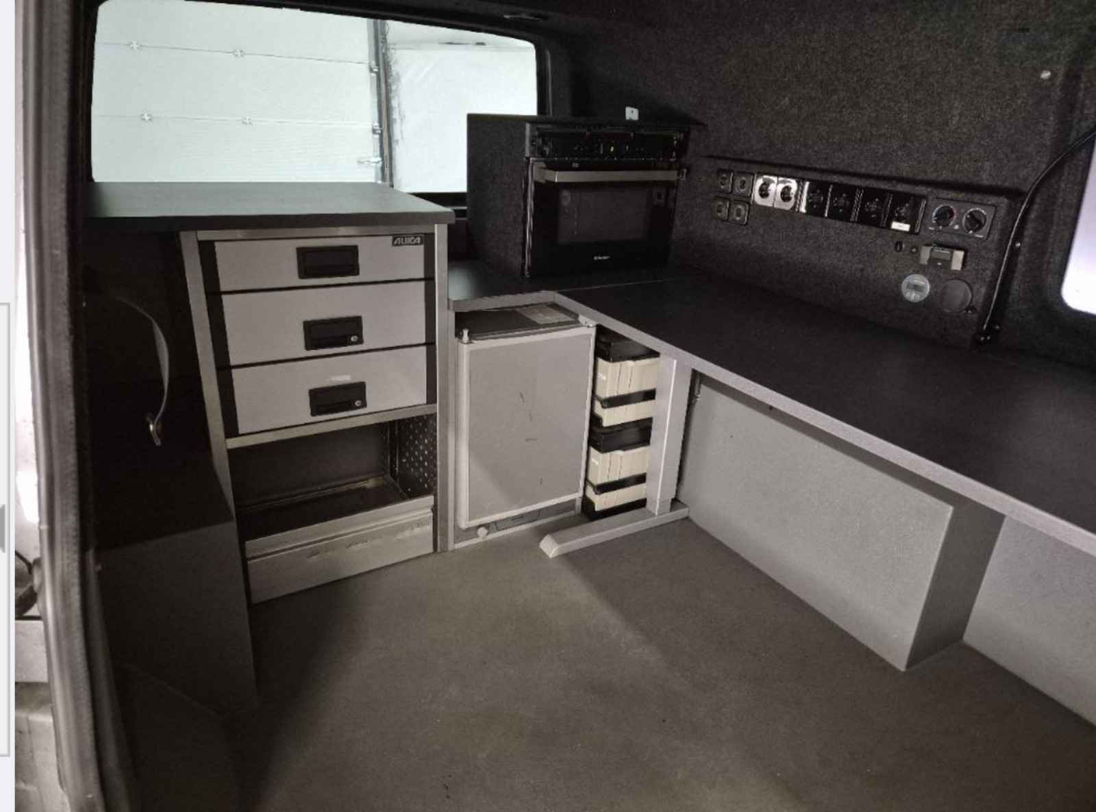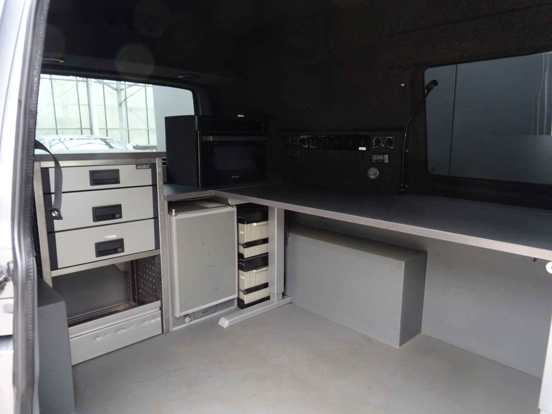 Laadruimte voorzien van eigenstroom voorziening dmv MWS functie, oventje, koelkast . Van cabine naar laadruim gaat via afsluitbare schuifdeur.