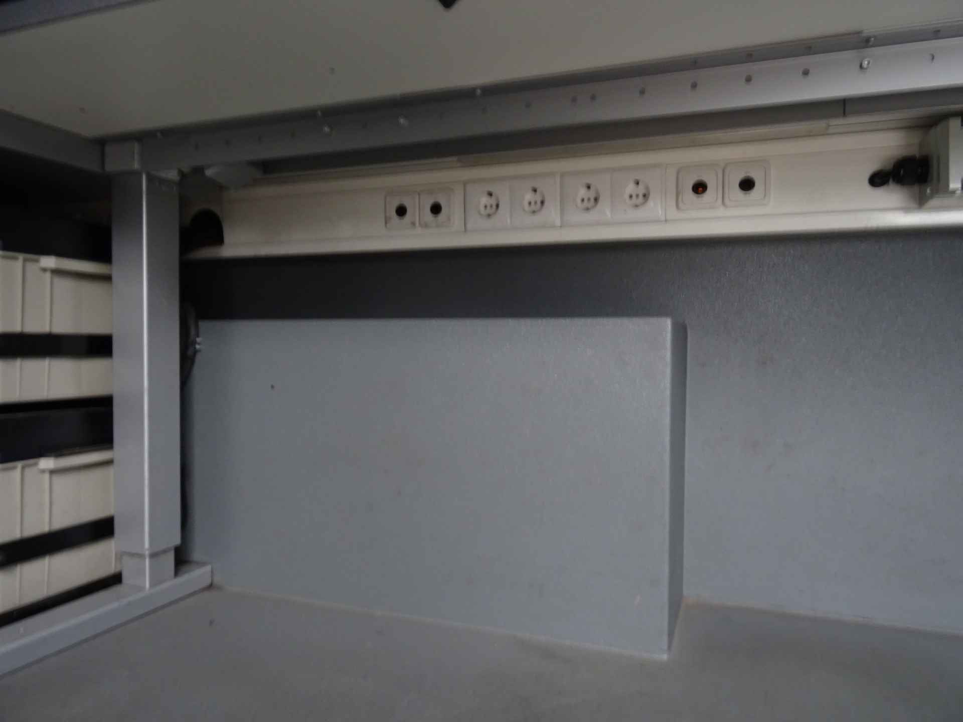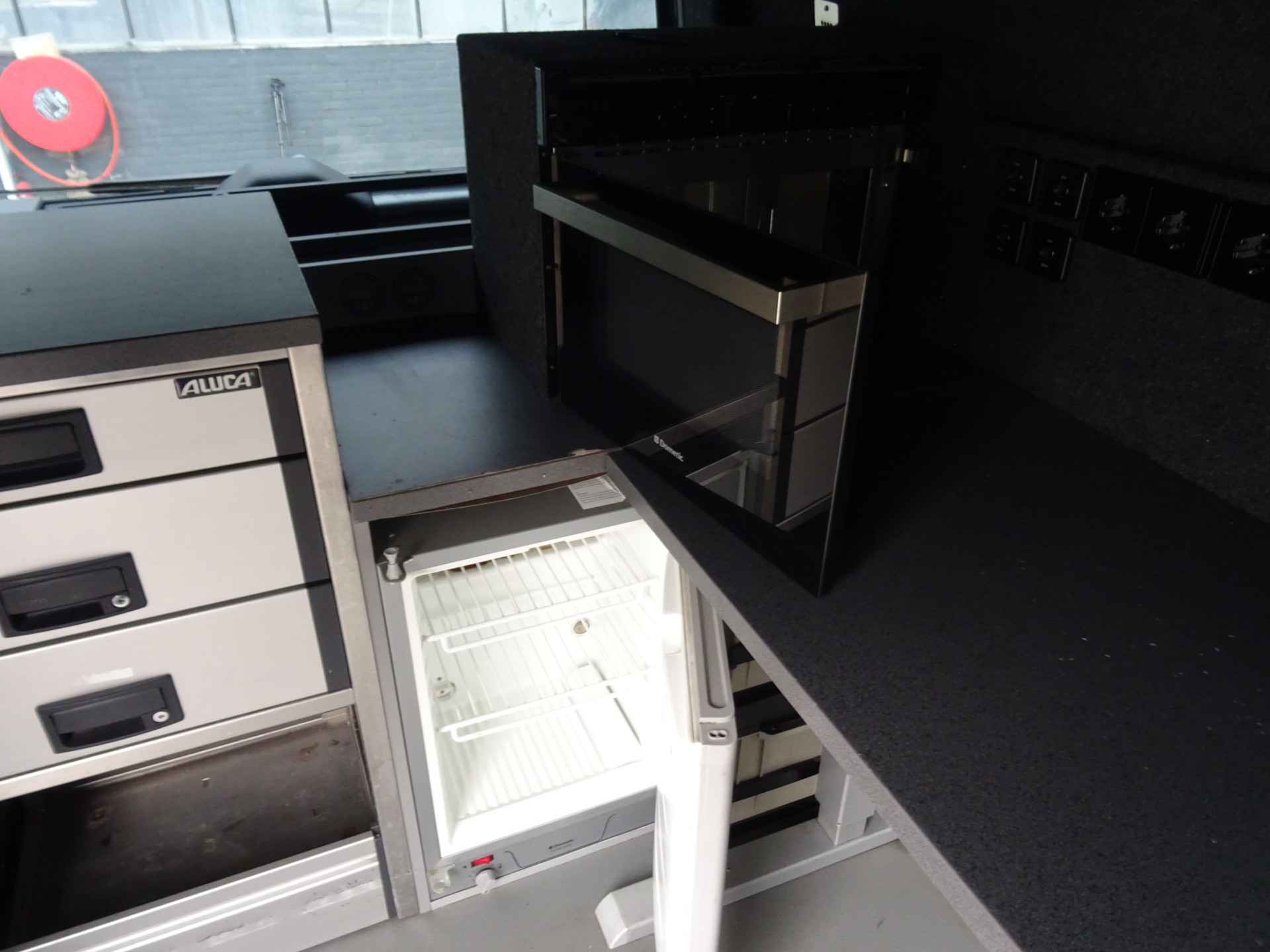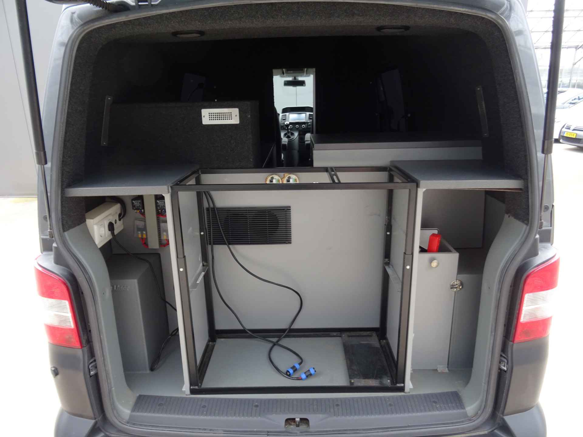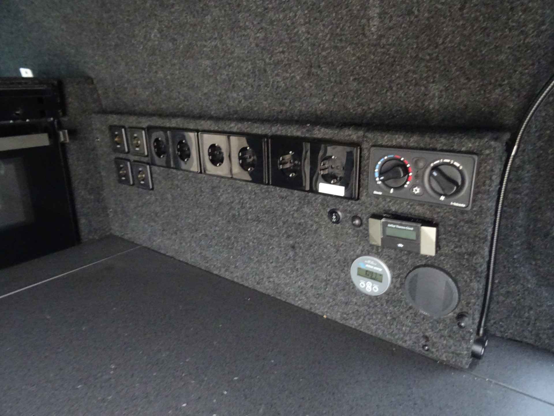 Laadruimte voorzien van eigenstroom voorziening dmv MWS functie, oventje, koelkast . Van cabine naar laadruim gaat via afsluitbare schuifdeur.