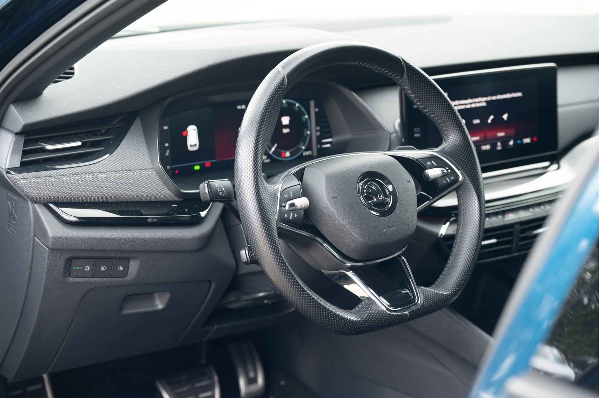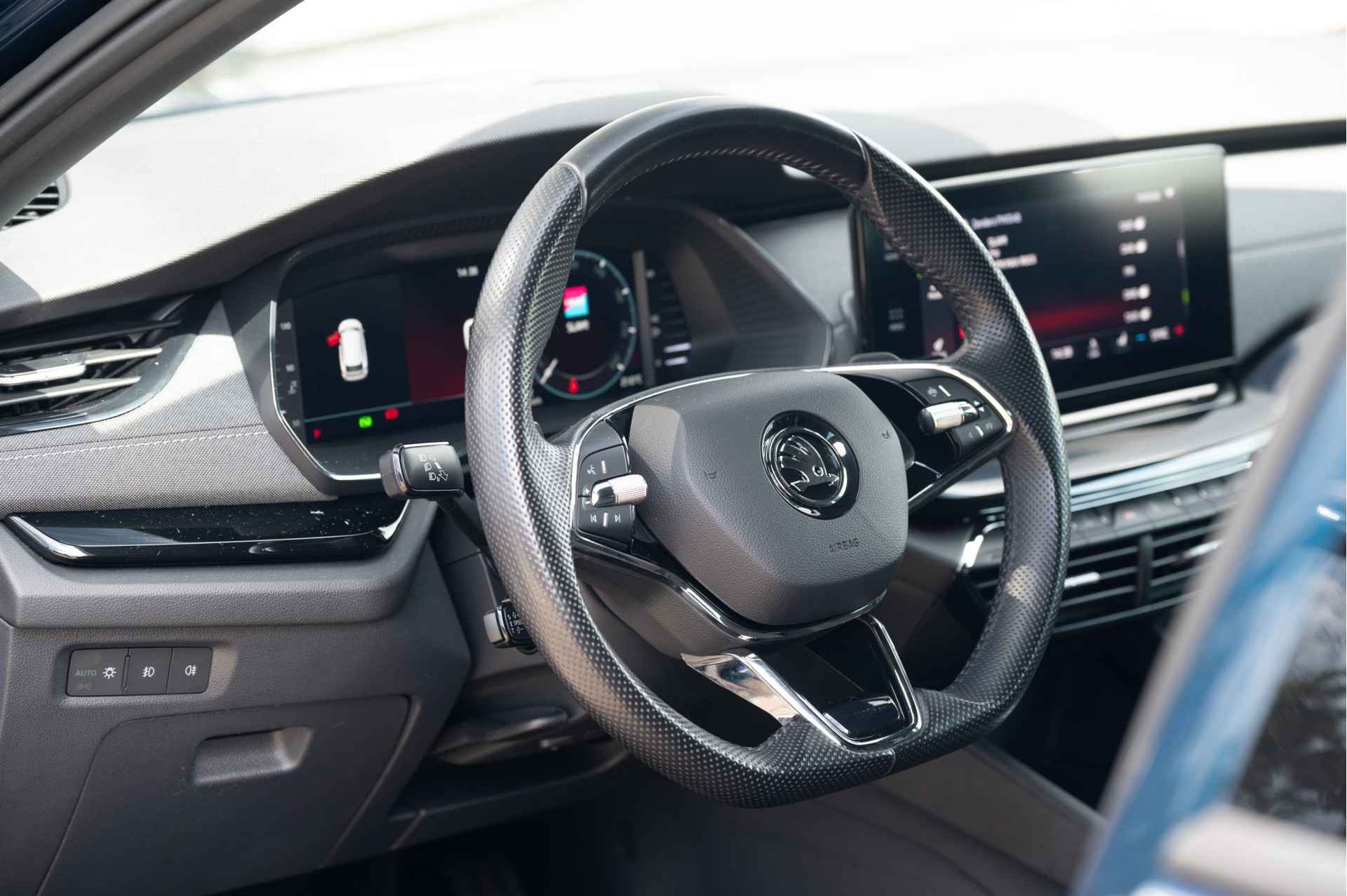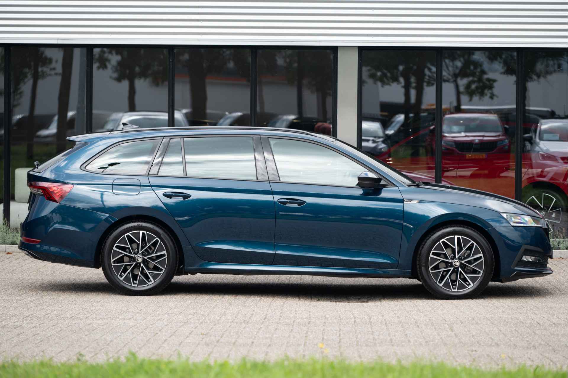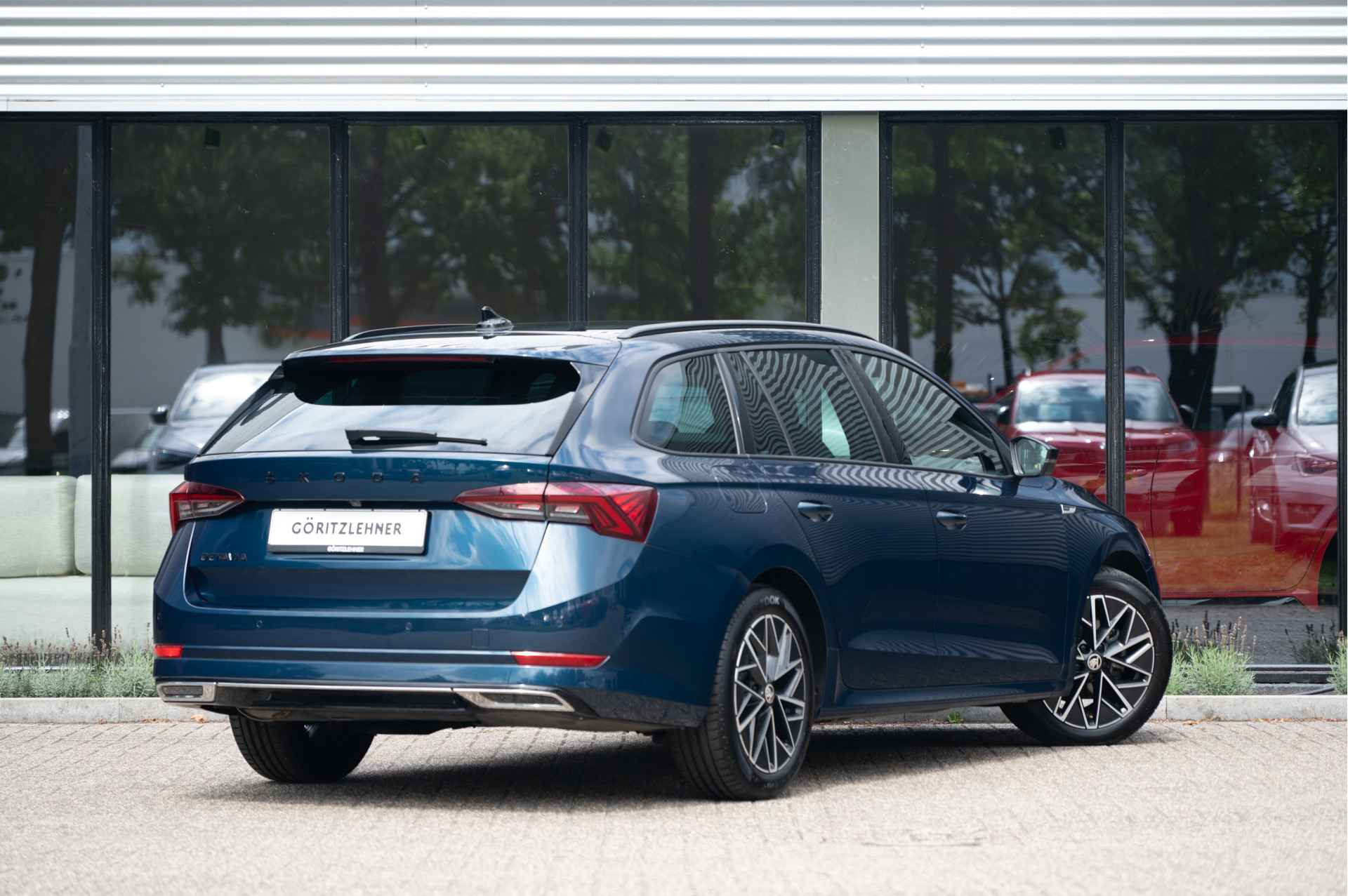 Een prachtige Lava Blue metallic Skoda Octavia Combi 1.5 e-TSI Sportline. Uitgerust met Matrix LED, Adaptieve cruise control, Navigatie, Apple CarPlay, virtual cockpit, elektrische achterklep, stoelverwarming, keyless en nog veel meer!